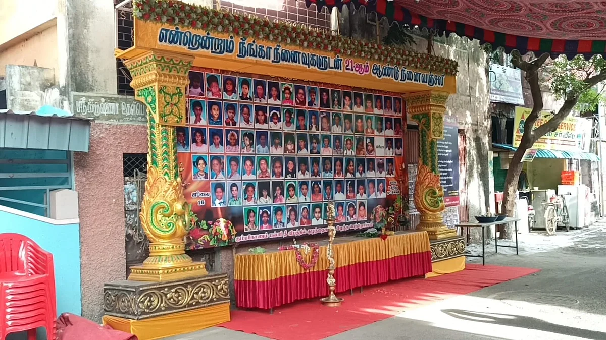 இந்த நிலையில் இன்று 21ம் ஆண்டு நினைவு நாள் அனுசரிக்கப்பட்டது. இதற்காக அந்த பள்ளி கட்டடம் முன்பு உயிரிழந்த குழந்தைகளின் போட்டோக்களுடன் ஃப்ளக்ஸ் வைக்கப்பட்டது. காலை முதல் உயிரிழந்த குழந்தைகளின் பெற்றோர் வந்து அஞ்சலி செலுத்தினர். தங்கள் பிள்ளைகளுக்கு பிடித்த பழம், பிஸ்கட் உள்ளிட்ட தின்பண்டங்கள், கூல்டிரிங்க்ஸ், பேனா உள்ளிட்டவற்றை வைத்தனர். மேலும் மலர் தூவி, மெழுகு வத்தி ஏற்றி அஞ்சலி செலுத்தினர்.