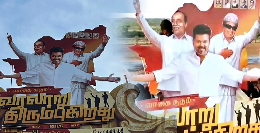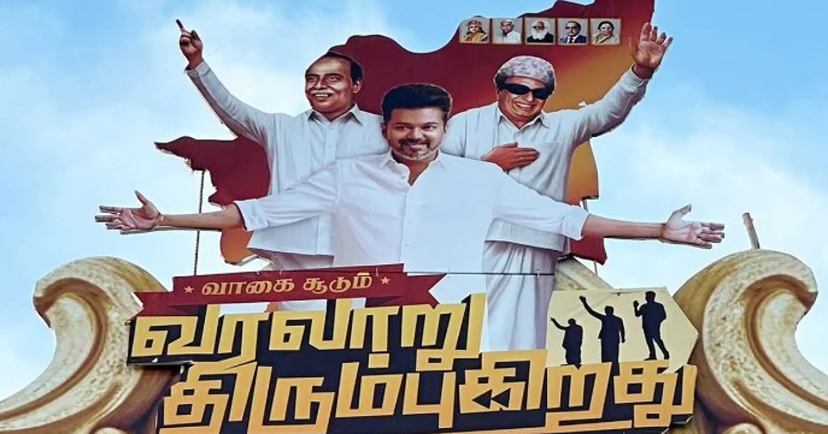 ‘மக்கள் விரும்பும் முதல்வர் வேட்பாளர் விஜய்’ என்ற வாசகத்தை பிரதானமாகப் பயன்படுத்தி மதுரையில் நடைபெறும் தவெக மாநாடு மேடையின் உச்சியில் திமுக நிறுவனரான அண்ணா மற்றும் அதிமுக நிறுவனரான எம்ஜிஆர் ஆகிய இருவரின் படங்கள் இடம்பெற்றுளது. இது அரசியல் வட்டாரத்தில் பேசுபொருளாகியிருக்கிறது.