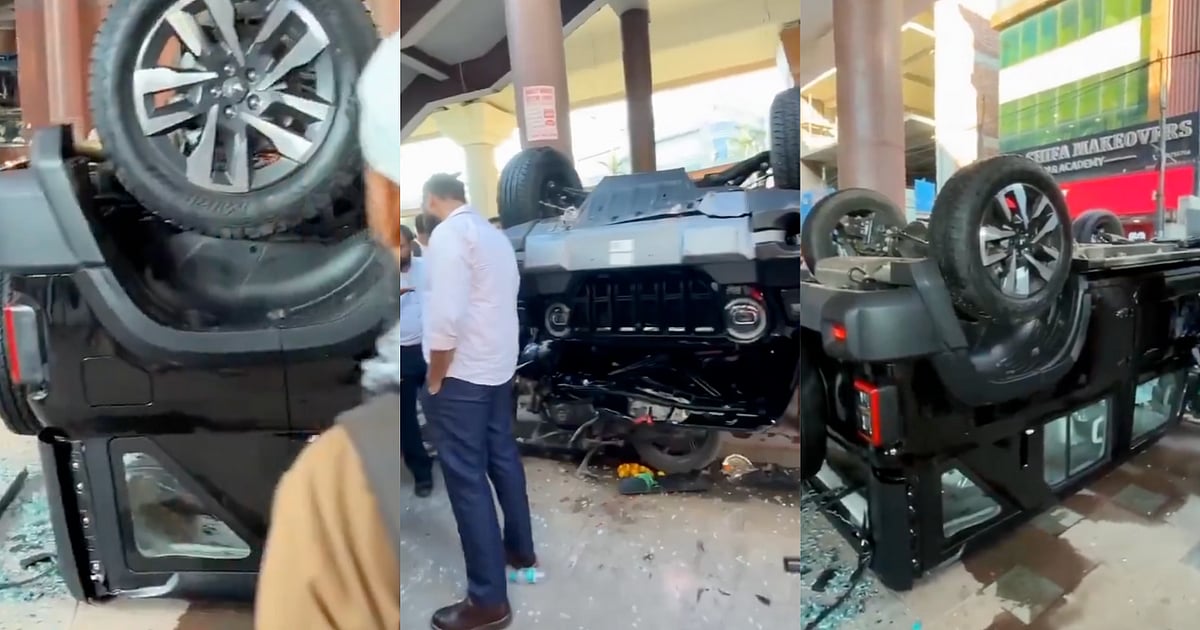 ஷோரூமுக்கு வெளியே கார் தலைகீழாக கவிழ்ந்தபடி கிடக்கும் வீடியோ இணையமெங்கும் பரவி வருகிறது. காரில் ஏர் பேக்குகள் வேலை செய்ததால் இருவருக்கும் உடலில் பெரும் சேதம் தவிர்க்கப்பட்டது.
