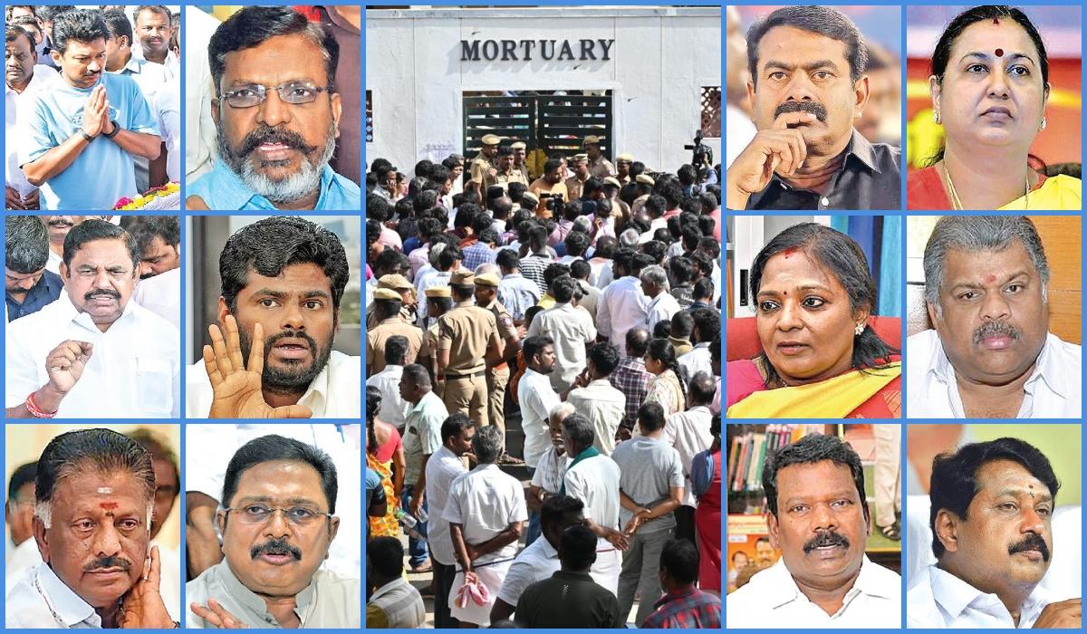 சந்தேகத்துக்கு தீர்வு வேண்டும்: ஜி.கே.வாசன் – ஜி.கே.வாசன் கூறியது: இச்சம்பவத்தில் ஏற்பட்டுள்ள சந்தேகங்களுக்கு தீர்வு காணவேண்டும். அரசியல் செய்யவேண்டிய நேரமில்லை. துயரமான சம்பவங்களுக்கு முற்றுப்புள்ளி வைக்க வேண்டும். ஆளுங்கட்சி கூட்டங்கள் என்றால் அதிகப்படியான பாதுகாப்பு வழங்குபவர்கள்.