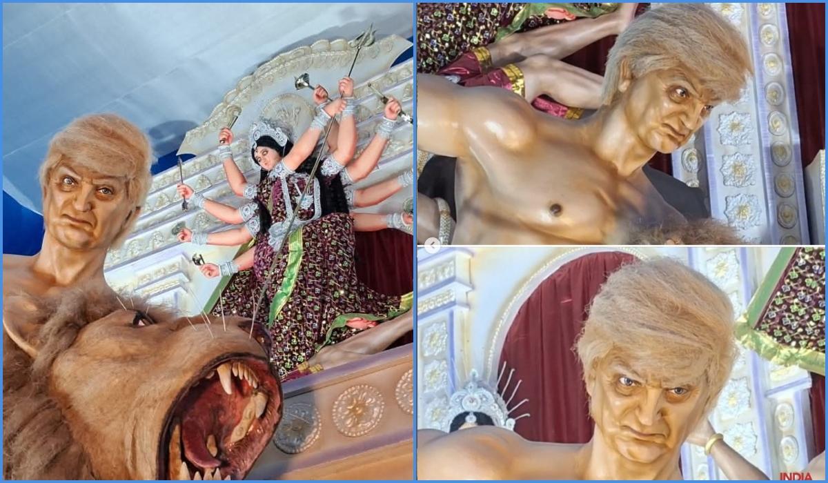 மேலும், நமது பிரதமர் மோடி, அதிபர் ட்ரம்பை நண்பராக பார்க்கிறார். ஆனால், அதிபர் ட்ரம்ப் நம்பிக்கை துரோகம் செய்துள்ளார். அதனால், ட்ரம்பை அசுரனாக சித்தரித்து துர்கா பூஜை பந்தலில் வைத்துள்ளோம்’’ என்றார்.