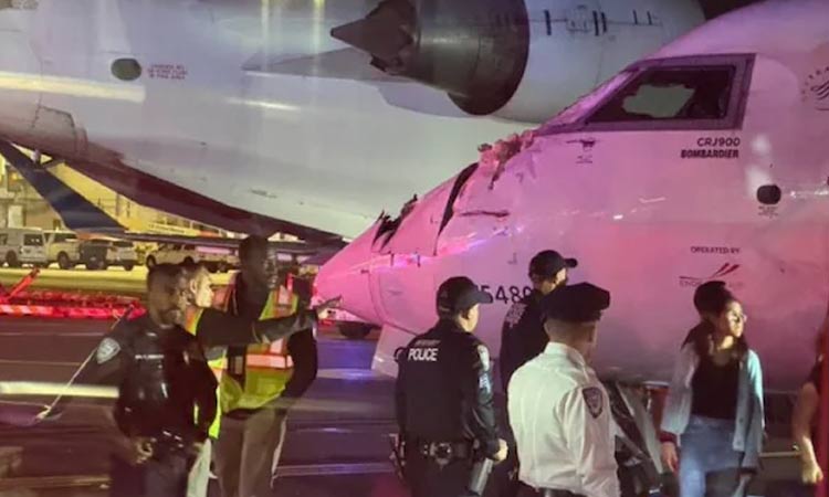 அமெரிக்க தலைநகர் நியூயார்க்கில் உள்ள லாகார்டியா விமான நிலையத்தில் இருந்து விர்ஜீனியாவுக்கு புறப்பட விமானம் ஒன்று தயாராக நின்று கொண்டிருந்தது. அப்போது வட கரோலினா மாகாணம் சார்லோட்டில் இருந்து புறப்பட்ட விமானம் லாகார்டியா விமான நிலையத்தில் தரையிறங்கியது. அப்போது அந்த விமானம் ஓடுதளத்தில் நின்று கொண்டிருந்த விமானத்தின் மீது மோதியது.