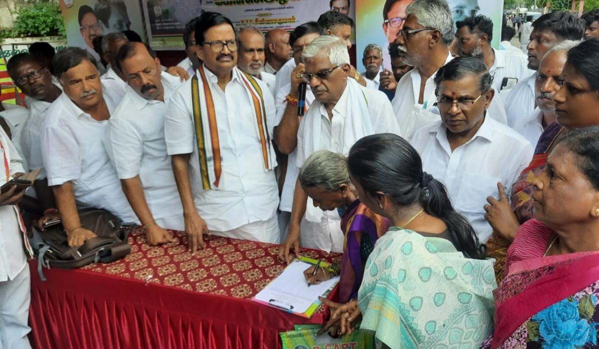 பிஹார் மாநிலத்தில் தேர்தல் ஆணையத்தின் துணையுடன் வாக்கு திருட்டில் ஈடுபட்ட பாஜக அரசை கண்டித்து காங்கிரஸ் கட்சி சார்பில் விழுப்புரத்தில் இன்று (அக்.7) கையெழுத்து இயக்கம் நடத்தப்பட்டது.