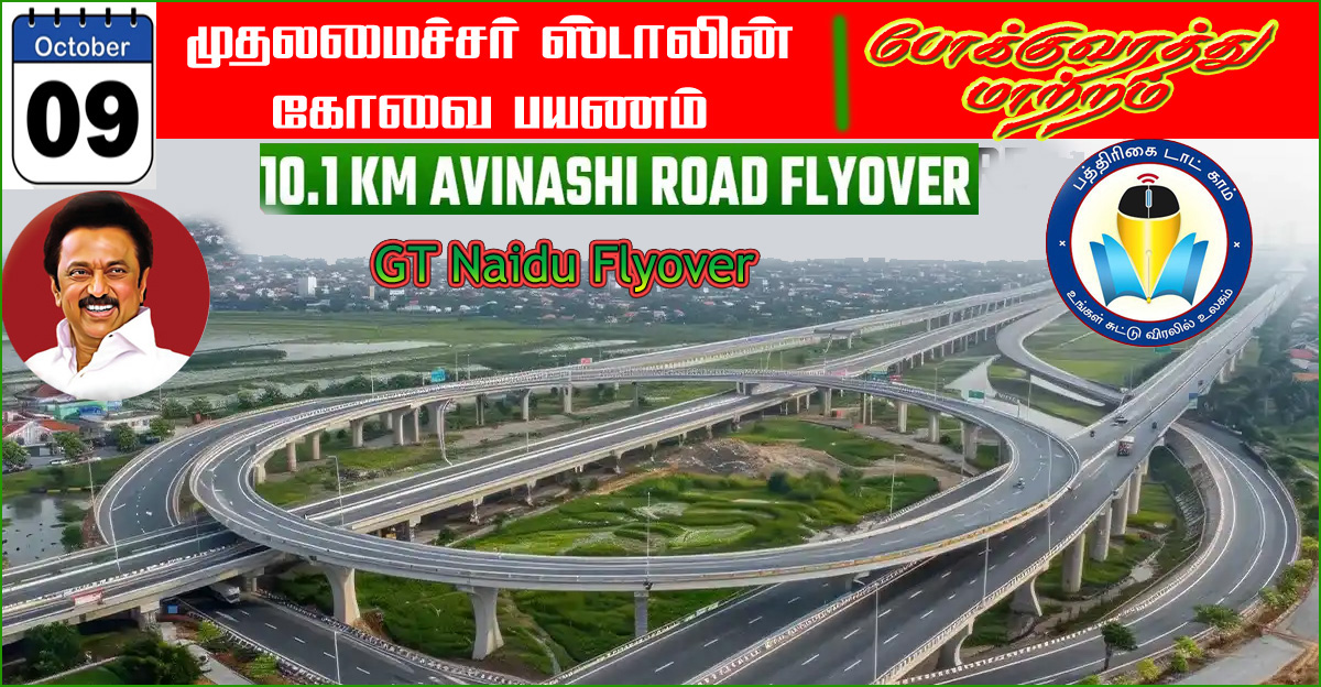 சென்னை: முதலமைச்சர் மு.க.ஸ்டாலின் நாளை மறுநாள் அக்டோபர் 9 ஆம் தேதி அவினாசி உயர்மட்ட பாலத்தை திறந்து வைப்பதற்காக கோவை செல்கிறார். இதையடுத்து, அங்கு போக்குவரத்து மாற்றம் குறித்து, காவல்துறை அறிவிப்பு வெளியிட்டுள்ளது. கோவையை அடுத்த அவினாசி பகுதியில் 10 கிலோமீட்டர் தூரத்துக்கு 17.25 மீட்டர் அகலத்தில் உயர்மட்ட பாலம் கட்டப்பட்டு உள்ளது. இந்த பாலத்துக்கு ஜிடி நாயு பாலம் என பெயர் வைக்கப்படும் என அறிவித்துள்ள முதல்வர் ஸ்டாலின், இந்த பாலத்தை திறந்து வைப்பதற்காக நாளை […]