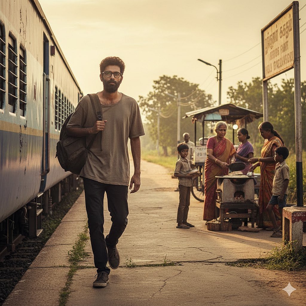 நீண்ட நெடிய மூச்சுடன் அந்த சிறிய ஸ்டேஷனில் வந்து நின்ற அந்த ரயிலிலிருந்து உதிர்ந்த ஒரு சிலரோடு தானும் இறங்கினான் சண்முகம்.