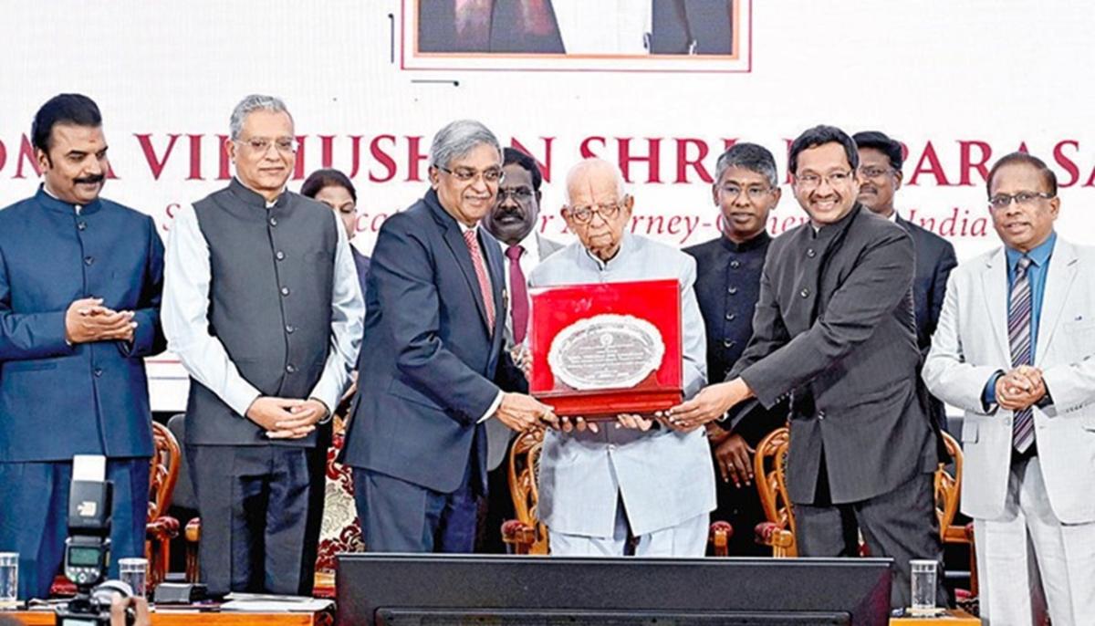 பத்ம விபூஷன் விருது பெற்ற உச்ச நீதிமன்ற மூத்த வழக்கறிஞரும், மத்திய அரசின் முன்னாள் தலைமை வழக்கறிஞருமான 98 வயதாகும் கே.பராசரன், 75 ஆண்டுகாலமாக வழக்கறிஞராக பணியாற்றி வருவதை கொண்டாடும் வகையில் பவள விழாவும், 50 ஆண்டுகளாக மூத்த வழக்கறிஞராக நிறைவு செய்திருப்பதை கொண்டாடும் வகையில் பொன் விழாவும் தமிழ்நாடு மற்றும் புதுச்சேரி பார் கவுன்சில் சார்பி்ல் நேற்று கொண்டாடப்பட்டது.