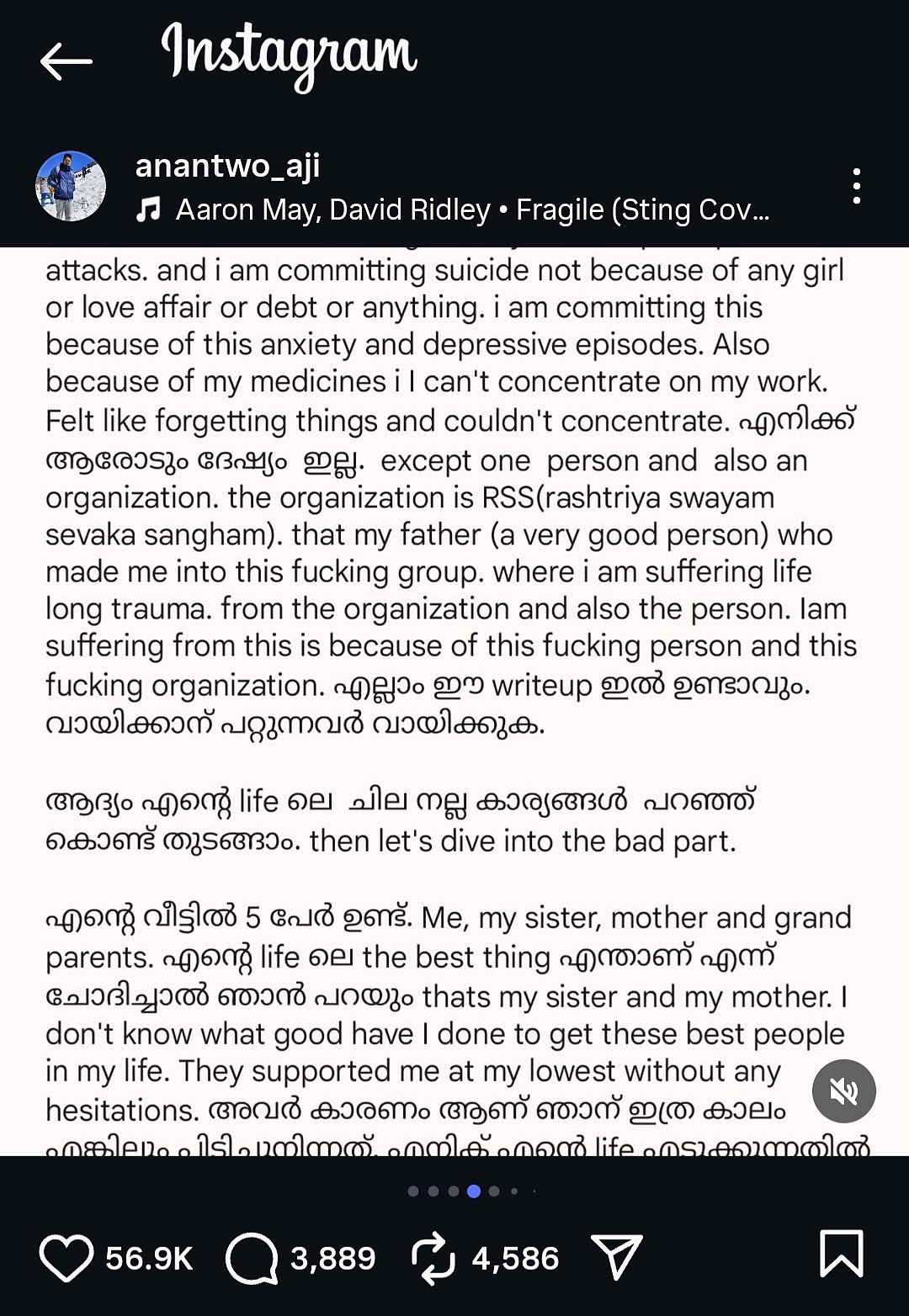 கேரள மாநிலம் கோட்டையம் தம்பலக்காடு பகுதியைச் சேர்ந்தவர் அனந்து அஜி(24). இவர் திருவனந்தபுரத்தில் கடந்த 9-ம் தேதி திடீரென தற்கொலை செய்து கொண்டார். அவர் தற்கொலை செய்யும் முன் தனது இன்ஸ்டாகிராம் பக்கத்தில் மரண காரணம் குறித்த பதிவை டைப் செய்து ஷெட்யூல் செய்து வைத்திருந்தார். அந்த இன்ஸ்டாகிரம் பதிவில் கூறியுள்ளதாவது: