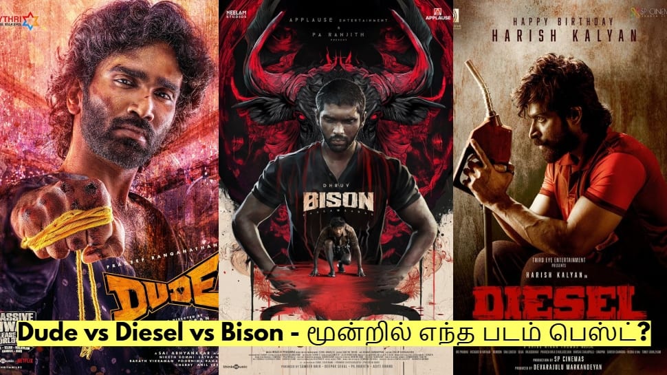 Diwali Tamil Movies: தீபாவளி பண்டிகையை முன்னிட்டு தமிழில் பிரதீப் நடித்த டியூட், ஹரிஷ் கல்யாண் நடித்த டீசல், துருவ் நடித்துள்ள பைசன் படங்கள் வெளியாக உள்ளது. இந்த மூன்றில் எந்த படம் பெஸ்ட் என்று தெரிந்து கொள்ளுங்கள்.