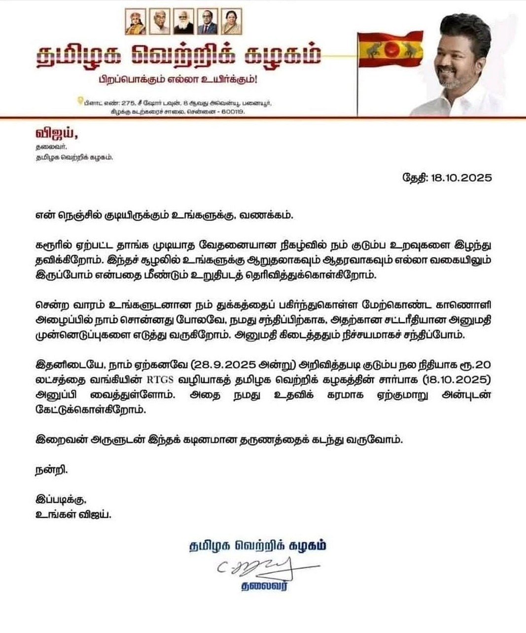 இதனிடையே, நாம் ஏற்கனவே (28.9.2025 அன்று) அறிவித்தபடி குடும்ப நல நிதியாக ரூ.20 லட்சத்தை வங்கியின் RTGS வழியாகத் தமிழக வெற்றிக் கழகத்தின் சார்பாக (18.10.2025) அனுப்பி வைத்துள்ளோம். அதை நமது உதவிக் கரமாக ஏற்குமாறு அன்புடன் கேட்டுக்கொள்கிறோம்.