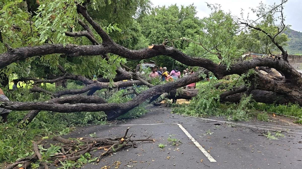 இதையடுத்து, மாநில நெடுஞ்சாலை துறையினர், மின்வாரிய துறையினர் அந்தந்த பகுதிகளுக்கு சென்று மரம் அறுக்கும் இயந்திரங்கள் மூலம் சாலையில் விழுந்த மரங்களை அறுத்து அகற்றினர். மின்வாரிய ஊழியர்கள் சாய்ந்து விழுந்த மின்கம்பங்களை சீரமைத்தனர்.