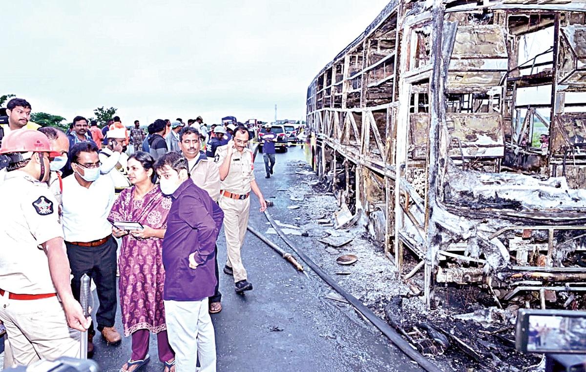 பேருந்தில் 2 ஓட்டுநர்கள் இருந்த நிலையில், ஒருவர் கீழே குதித்து தப்பி தலைமறைவாகிவிட்டார். மற்றொருவரை போலீஸார் கைது செய்துள்ளனர். இதற்கிடையே, தகவல் அறிந்து, கர்னூல் போலீஸார், தீயணைப்பு படையினர், ஆம்புலன்ஸ்களில் விரைந்து வந்து மீட்புப் பணியில் ஈடுபட்டனர்.பலர் இருக்கைகளில் அமர்ந்தநிலையிலேயே எரிந்து உயிரிழந்துள்ளனர். முழுவதுமாக எரிந்துஎலும்புக் கூடாக மாறியவர்களை அடையாளம் காண முடியவில்லை. இதனால், சம்பவ இடத்திலேயே கூடாரம் அமைத்து டிஎன்ஏ பரிசோதனை நடத்தப்பட்டது.