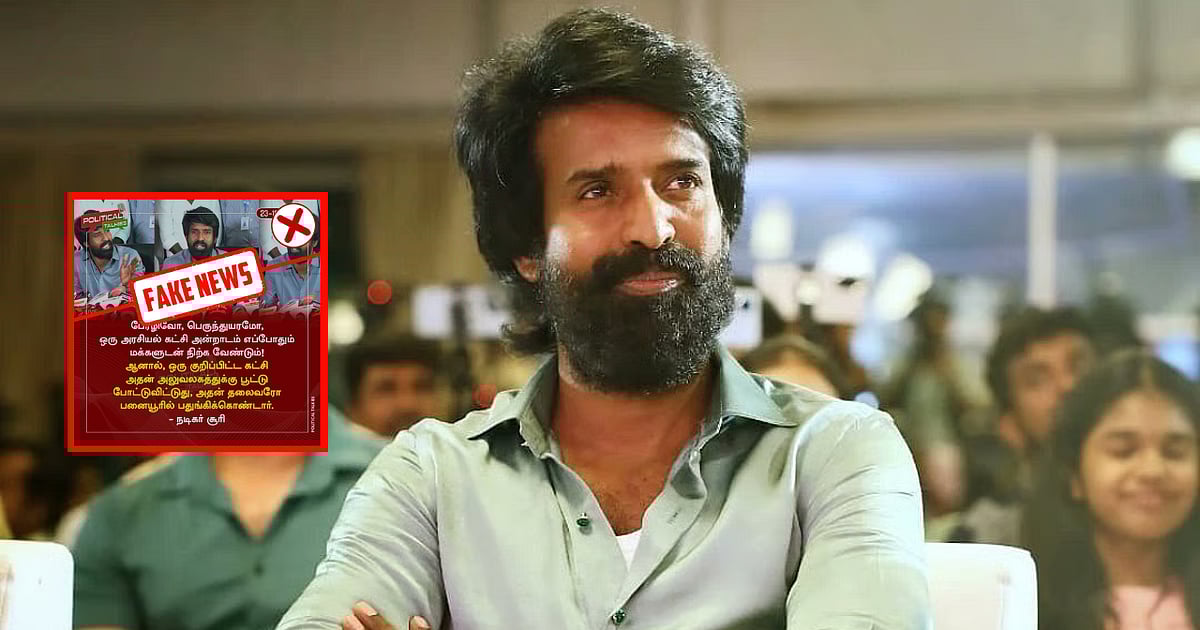சமூக வலைத்தளங்களில் பரவும் பொய்ச் செய்தியில், “பேரழிவோ, பெருந்துயரமோ, ஒரு அரசியல் கட்சி அன்றாடம் எப்போதும் மக்களுடன் நிற்க வேண்டும்! ஆனால், ஒரு குறிப்பிட்ட கட்சி அதன் அலுவலகத்துக்கு பூட்டுப் போட்டுவிட்டது, அதன் தலைவரோ பனையூரில் பதுங்கிக்கொண்டார். – நடிகர் சூரி” எனக் குறிப்பிடப்பட்டுள்ளது.