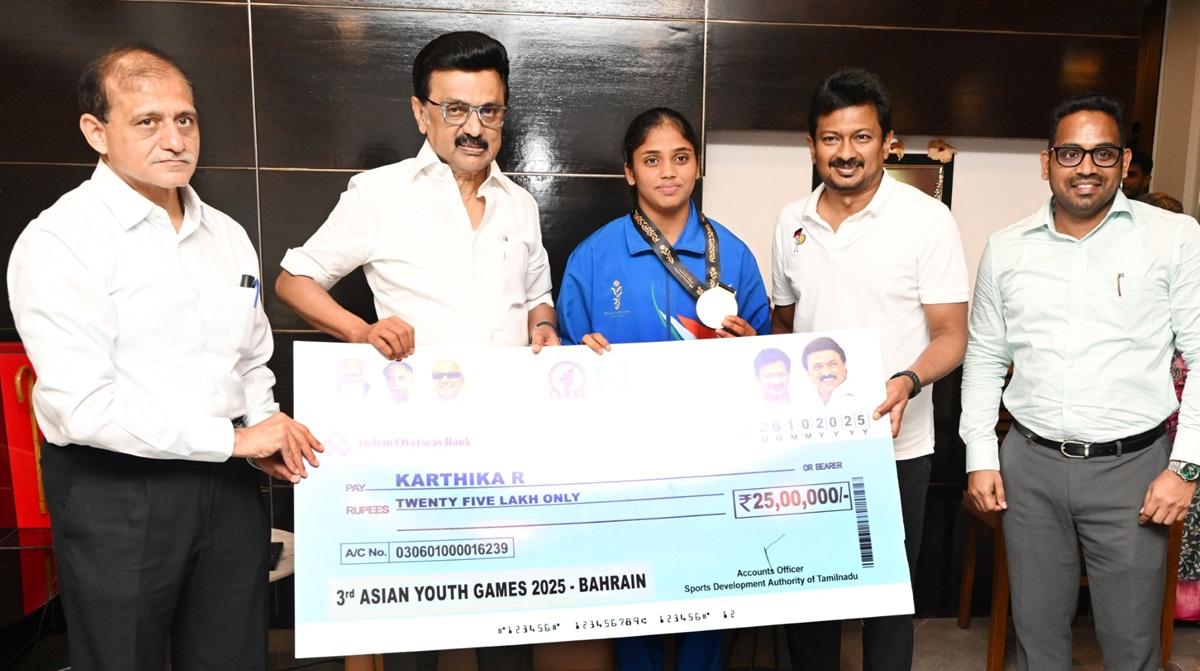 இது குறித்து தமிழக அரசு வெளியிட்ட செய்திக்குறிப்பில், ‘முதல்வர் ஸ்டாலின் இன்று (26.10.2025) முகாம் அலுவலகத்தில், ஆசிய இளையோர் விளையாட்டுப் போட்டியில் தங்கப் பதக்கம் வென்ற தமிழ்நாட்டைச் சேர்ந்த கபடி வீரர்கள் அபினேஷ் மோகன்தாஸ் மற்றும் கார்த்திகா ரமேஷ் ஆகியோரை பாராட்டி, ஊக்கத்தொகையாக தலா 25 லட்சம் ரூபாய்க்கான காசோலைகளை வழங்கி, வாழ்த்தினார்.