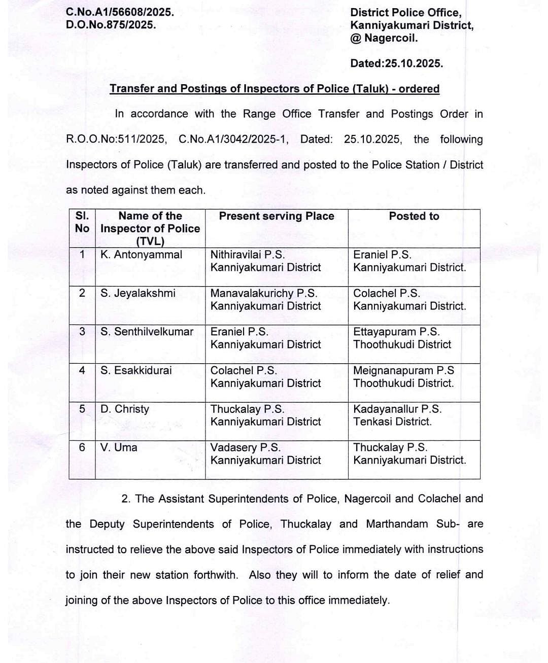 நேசமணி நகர் சப் இன்ஸ்பெக்டர் ஜெஸி மேனகா, சுசீந்திரம் சப் இன்ஸ்பெக்டர் பெனடிக்ட், புதுக்கடை சப் இன்ஸ்பெக்டர் மகேந்திரன் ஆகியோர் நெல்லை மாவட்டத்திற்கு இடமாற்றம் செய்யப்பட்டுள்ளனர். மாவட்ட குற்றப்பிரிவு சப் இன்ஸ்பெக்டர் ரவிச்சந்திரன் தக்கலை மதுவிலக்கு பிரிவிற்கும், மார்த்தாண்டம் அனைத்து மகளிர் காவல் நிலைய சப் இன்ஸ்பெக்டர் மீனாகுமாரி நில அபகரிப்பு பிரிவிற்கும், வடசேரி சப் இன்ஸ்பெக்டர் கீதா திருவட்டாருக்கும், கன்னியாகுமரி சப் இன்ஸ்பெக்டர் எட்வர்ட் பிரைட் சுசீந்திரத்திற்கும், மாவட்ட குற்றப்பிரிவு சப் இன்ஸ்பெக்டர் சார்லட் கோட்டாருக்கும் இடமாற்றம் செய்யப்பட்டுள்ளனர். இதுதவிர அன்பு பிரகாஷ் இன்ஸ்பெக்டராக இருந்த நேசமணிநகர் காவல்நிலைய சப் இன்ஸ்பெக்டர் அசோகன், ஏட்டு சதீஷ் மற்றும் இன்ஸ்பெக்டரின் டிரைவர்கள் ராதாகிருஷ்ணன், விஜில் ஆகிய 4 பேரை ஆயுதப்படைக்கு மாற்றி எஸ்.பி ஸ்டாலின் உத்தரவிட்டுள்ளார். மேலும், மோசமான செயல்பாடுகொண்ட, பல ஆண்டுகளாக தொடர்ந்து குமரி மாவட்டத்தில் பணிபுரியும் போலீஸ் அதிகாரிகளை இடம் மாற்றுவதற்காக இரண்டாம்கட்ட லிஸ்ட் தயாராகி வருவதாகவும் விரைவில் அதிரடி மாற்றங்கள் இருக்கும் எனவும் கூறப்படுகிறது.