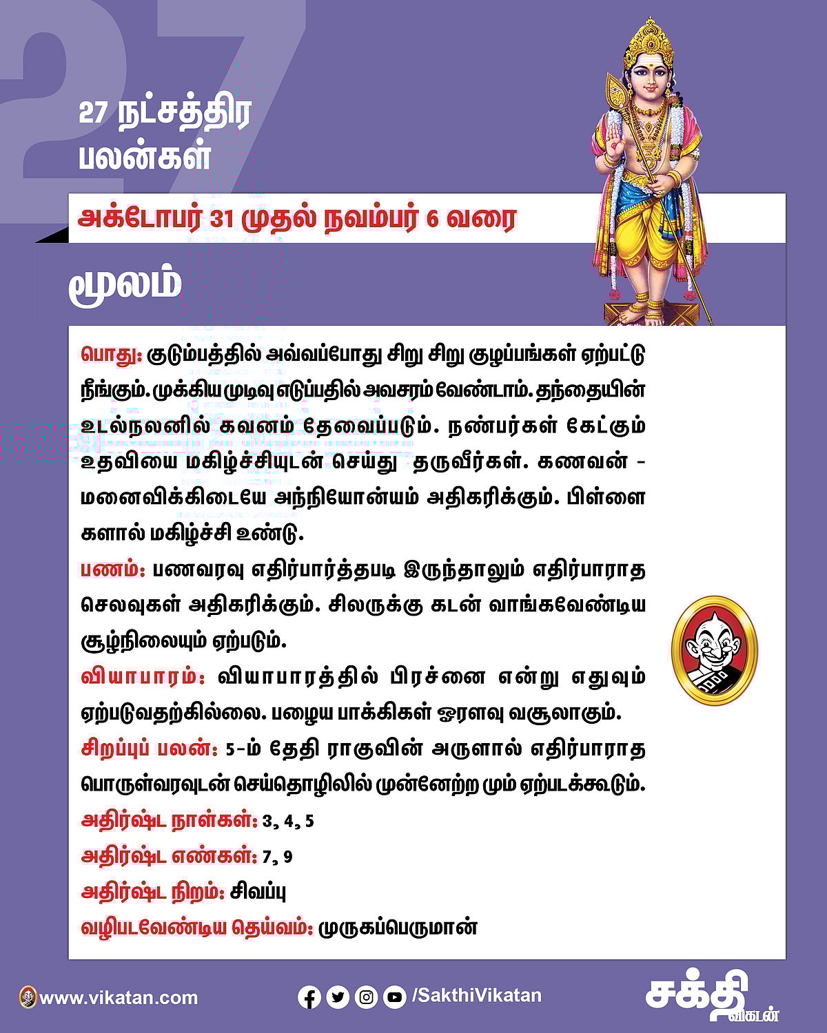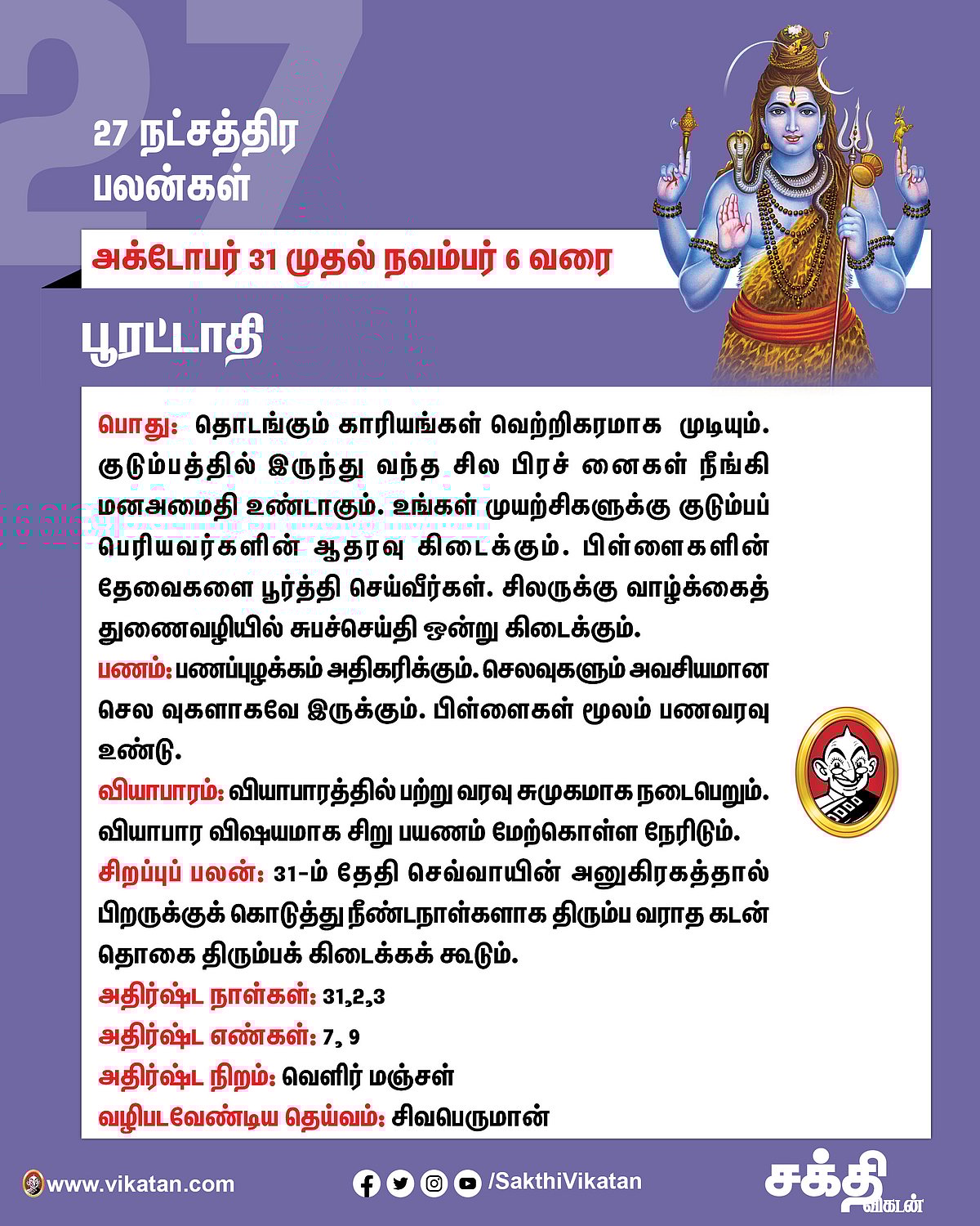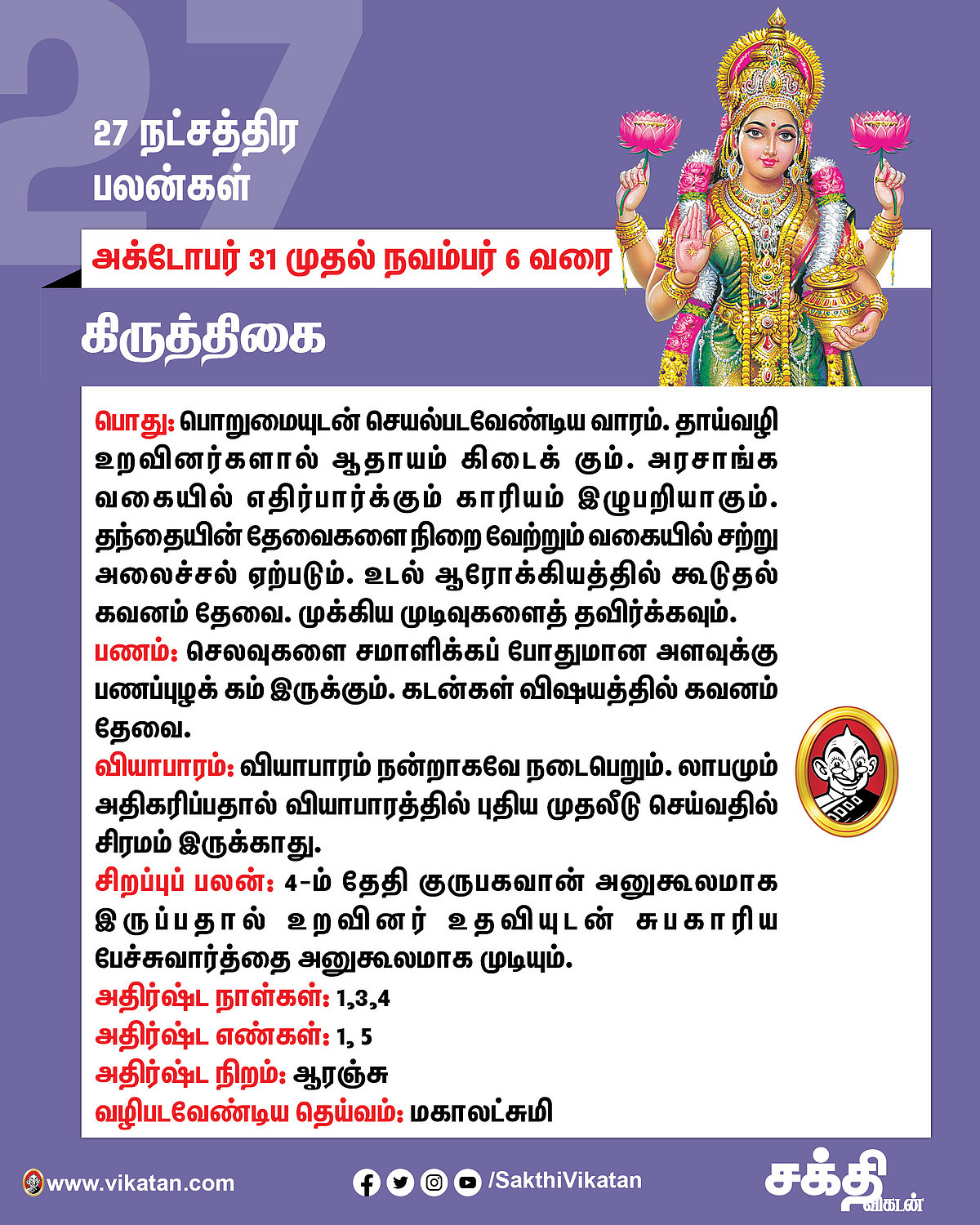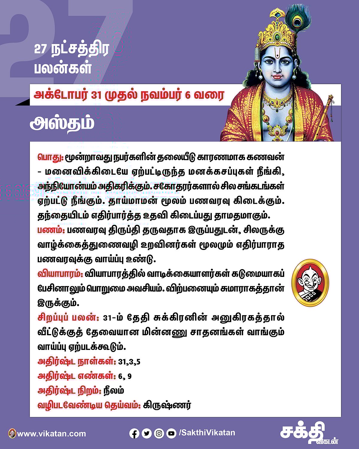நட்சத்திரப் பலன்கள் அக்டோபர் 31 முதல் நவம்பர் 6 வரை #VikatanPhotoCards October 31, 2025 by விகடன் அசுவினி பரணி கிருத்திகை ரோகிணி மிருகசீரிடம் Source link