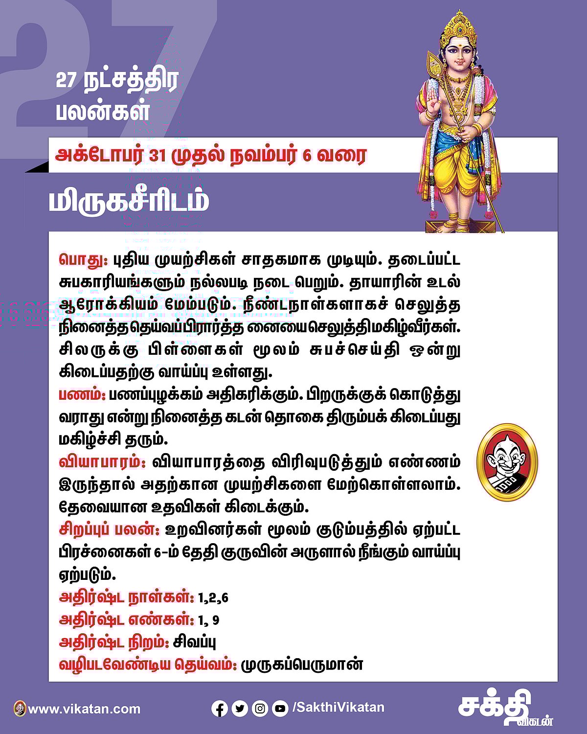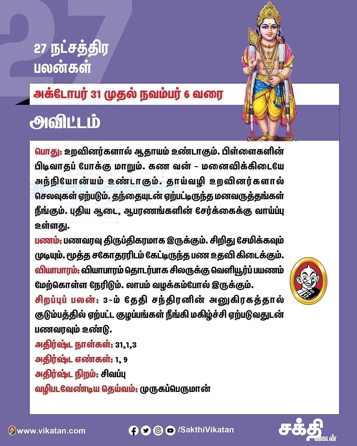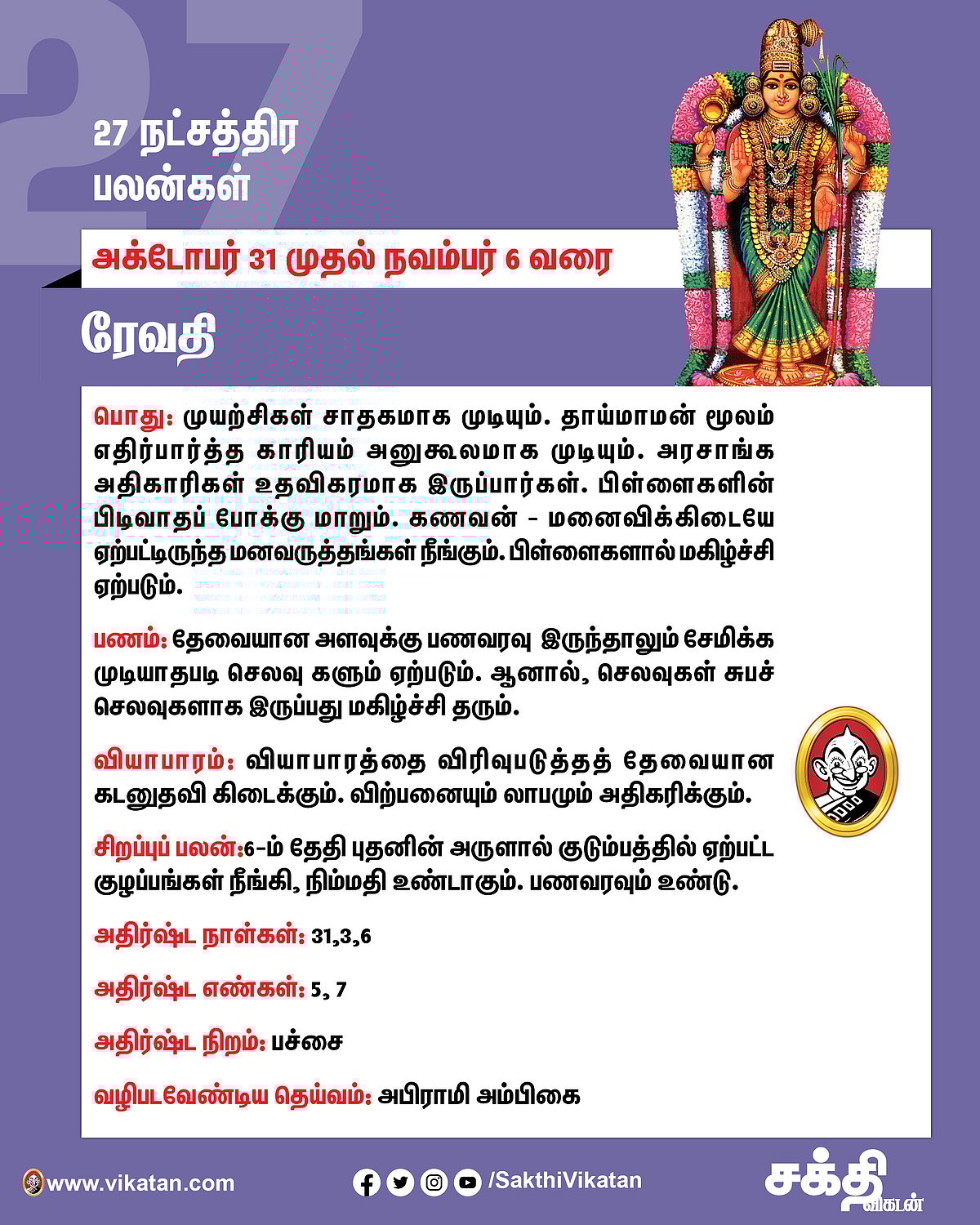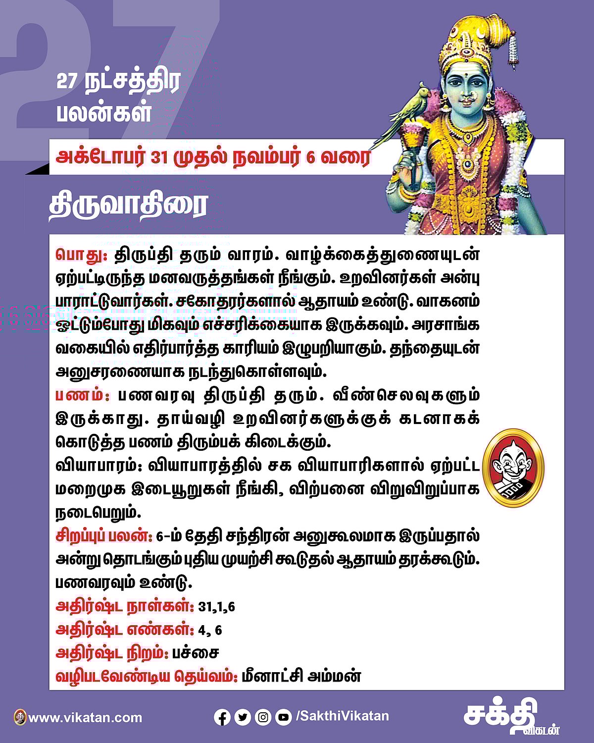 நட்சத்திரப் பலன்கள் அக்டோபர் 31 முதல் நவம்பர் 6 வரை #VikatanPhotoCards October 31, 2025 by விகடன் அசுவினி பரணி கிருத்திகை ரோகிணி மிருகசீரிடம் Source link