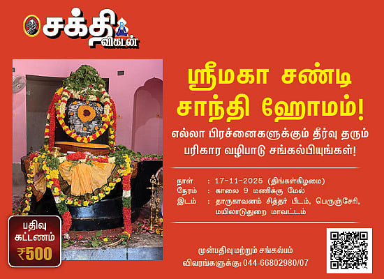 இதனால் வரும் 17-11-2025 கார்த்திகை முதல் சோமவார நன்னாளில் திங்கள்கிழமை காலை 9 மணிக்கும் மேல் லோக க்ஷேமத்துக்காகவும் சக்தி விகடன் வாசகர்கள் நல்வாழ்வுக்காகவும் இங்கு மகாசண்டி ஹோமம் நடைபெற உள்ளது. இந்த சிறப்பு மகா சண்டி ஹோமத்தில் சங்கல்பித்துக் கொண்டால் உங்கள் பிரச்னைகள் யாவும் நிச்சயம் நீங்கும்.