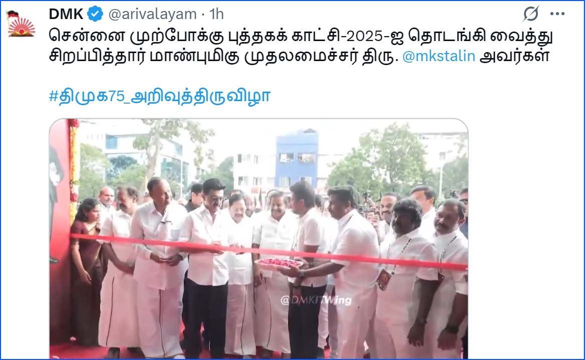 சென்னை: திமுகவின் அறிவுத் திருவிழாவில் “காலத்தின் நிறம் கருப்பு சிவப்பு” புத்தகத்தை முதலமைச்சர் மு.க.ஸ்டாலின் வெளியிட்டார். இதைத்தொடர்ந்து கருத்தரங்கத்தை தொடங்கி வைத்தார். சென்னையில் திமுகவின் 75வது ஆண்டு விழாவையொட்டி இன்று அறிவு திருவிழா தொடங்கி உள்ளது. இன்று நடைபெறும் அறிவு திருவிழாவில் முதலமைச்சர் மு.க.ஸ்டாலின் கலந்துகொண்டு, “காலத்தின் நிறம் கருப்பு சிவப்பு” புத்தகத்தை முதலமைச்சர் வெளியிட்டார். தொடர்ந்து, ‘இருவண்ணக்கொடிக்கு வயது 75’ எனும் தலைப்பில் நடைபெறும் 2 நாட்கள் கருத்தரங்கத்தையும் தொடங்கி வைத்தார். தமிழ்நாடு முதலமைச்சர் மு.க.ஸ்டாலின் […]