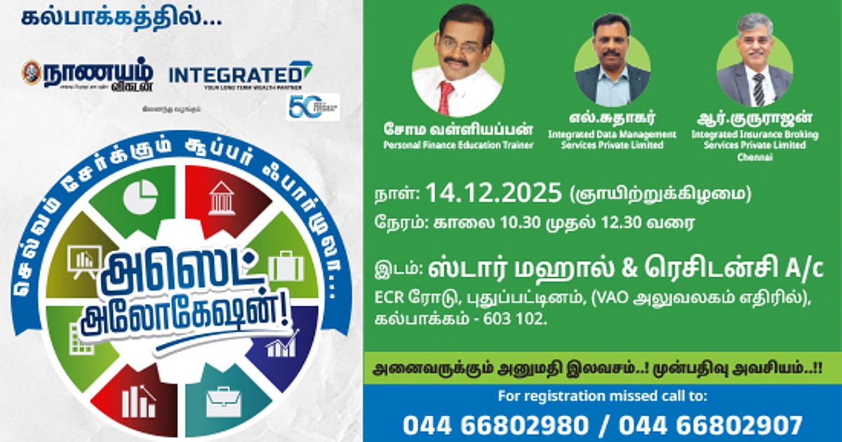 இந்தச் சொத்து ஒதுக்கீடு தொடர்பான விழிப்புணர்வு முதலீட்டுக் கூட்டத்தை நாணயம் விகடன் & இன்டிக்ரேட்டெட் இணைந்து ‘செல்வம் சேர்க்கும் சூப்பர் ஃபார்முலா… அஸெட் அலோகேஷன்!’ சிறப்பு நிகழ்ச்சியாக நடத்துகிறது.