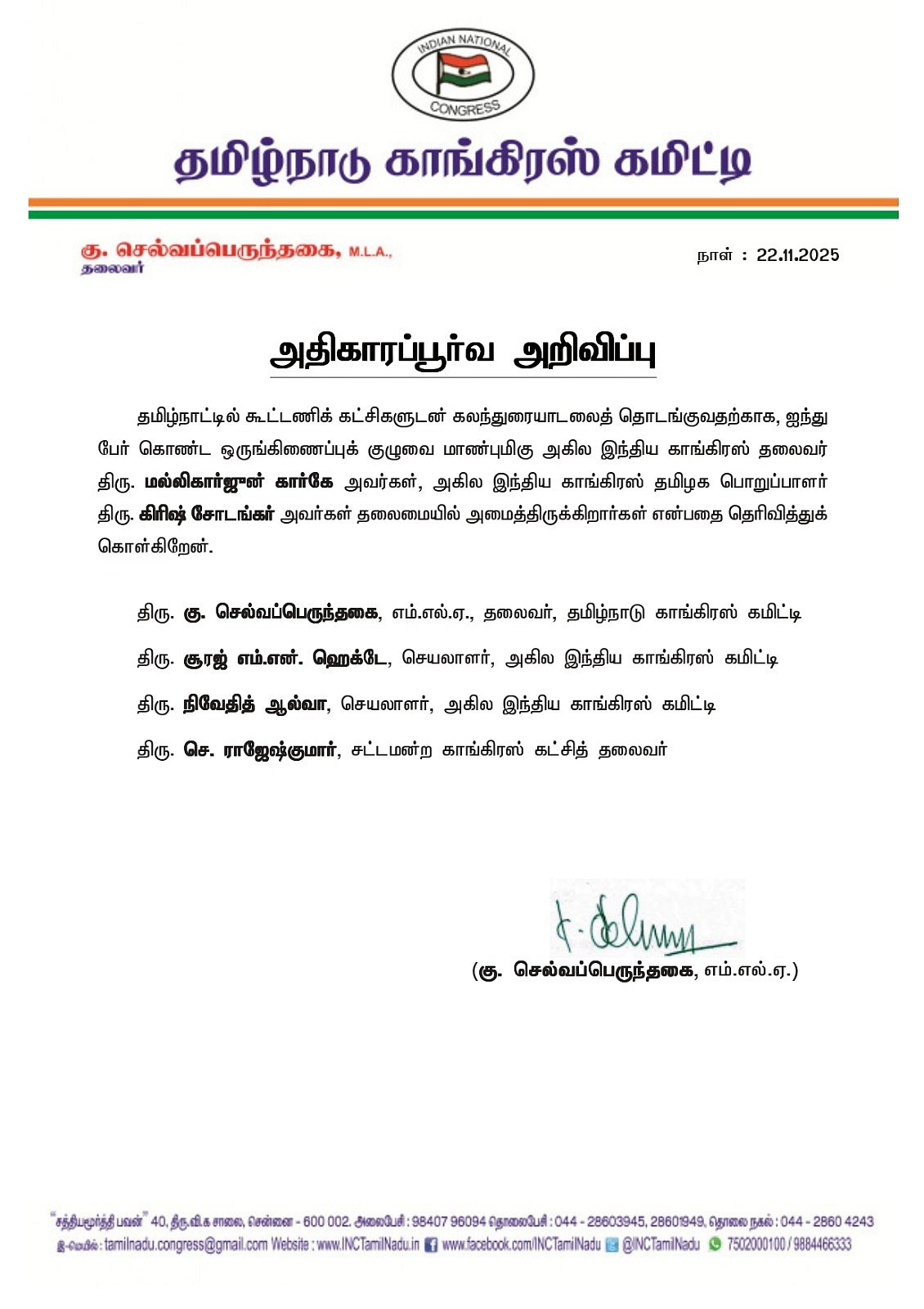 அந்த அறிக்கையில், “தமிழ்நாட்டில் கூட்டணிக் கட்சிகளுடன் கலந்துரையாடலைத் தொடங்குவதற்காக, ஐந்து பேர் கொண்ட ஒருங்கிணைப்புக் குழுவை மாண்புமிகு அகில இந்திய காங்கிரஸ் தலைவர் திரு. மல்லிகார்ஜுன் கார்கே அவர்கள், அகில இந்திய காங்கிரஸ் தமிழக பொறுப்பாளர் திரு. கிரிஷ் சோடங்கர் அவர்கள் தலைமையில் அமைத்திருக்கிறார்கள் என்பதை தெரிவித்துக் கொள்கிறேன்.