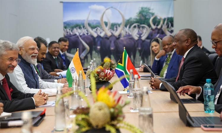 பிரதமர் மோடி இன்று தென் ஆப்பிரிக்க அதிபர் சிறில் ரமபோசாவை சந்தித்தார். இந்த சந்திப்பின்போது இருநாட்டு உறவு, வர்த்தகம், முதலீடு, தொழில்நுட்பம் உள்பட பல்வேறு விவகாரங்கள் குறித்து இருநாட்டு தலைவர்களும் ஆலோசனை நடத்தினர். தென் ஆப்பிரிக்க பயணத்தை முடித்துக்கொண்டு பிரதமர் மோடி இன்று நாடு திரும்புகிறார்.