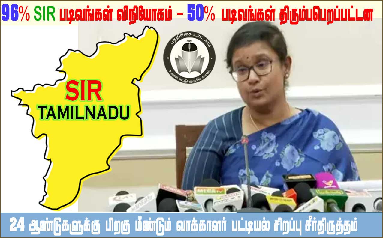 சென்னை: தமிழ்நாட்டில் இதுவரை 96 சதவீதம் அளவுக்கு SIR படிவங்கள் விநியோகம் செய்யப்பட்டு உள்ளதாகவும், 50% எஸ்ஐஆர் படிவங்கள் பூர்த்தி செய்தபின் திரும்பப் பெறப்பட்டன என கூறிய தலைமை தேர்தல் அதிகாரி அர்ச்சனா பட்நாயக், நாட்டிலேயே அதிக அளவில் பிஎல்ஓக்களுக்கு பயிற்சி அளிக்கப்பட்டு உள்ளதாகவும் சுட்டிக்காட்டினார். தமிழ்நாட்டில், இதுவரை வழங்கப்பட்ட எஸ்.ஐ.ஆர். படிவங்களில் 50 சதவீதம் பூர்த்தி செய்தபின் திரும்பப் பெறப்பட்டன என தெரிவித்துள்ள தேர்தல் அதிகாரி அர்ச்சனா பட்நாயக். தமிழ்நாட்டில் எஸ்.ஐ.ஆர் பணிகள் தொடர்பாக இந்திய […]