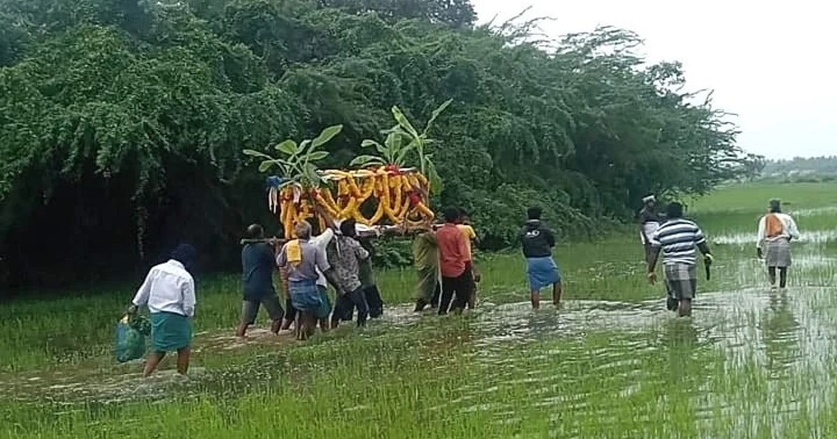 வயல்வெளி வழியே சுடுகாட்டிற்கு செல்லும் மக்கள்
