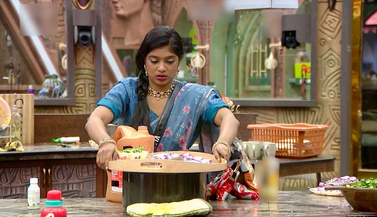 பாருவிற்கு உதவியாளராக செல்ல எவரும் முன்வரவில்லை. விதிமீறல் ஆகி விடும் என்பது காரணம். அதற்கும் தனியாகச் சென்று அழுது தீர்த்தார் பாரு. ஒருவழியாக பழைய கூட்டாளியான எஃப்ஜே எழுந்த வர, மக்களுக்கு வடித்துக் கொட்டுவதற்காக எரிச்சலுடன் எழுந்து சென்றார் பாரு.