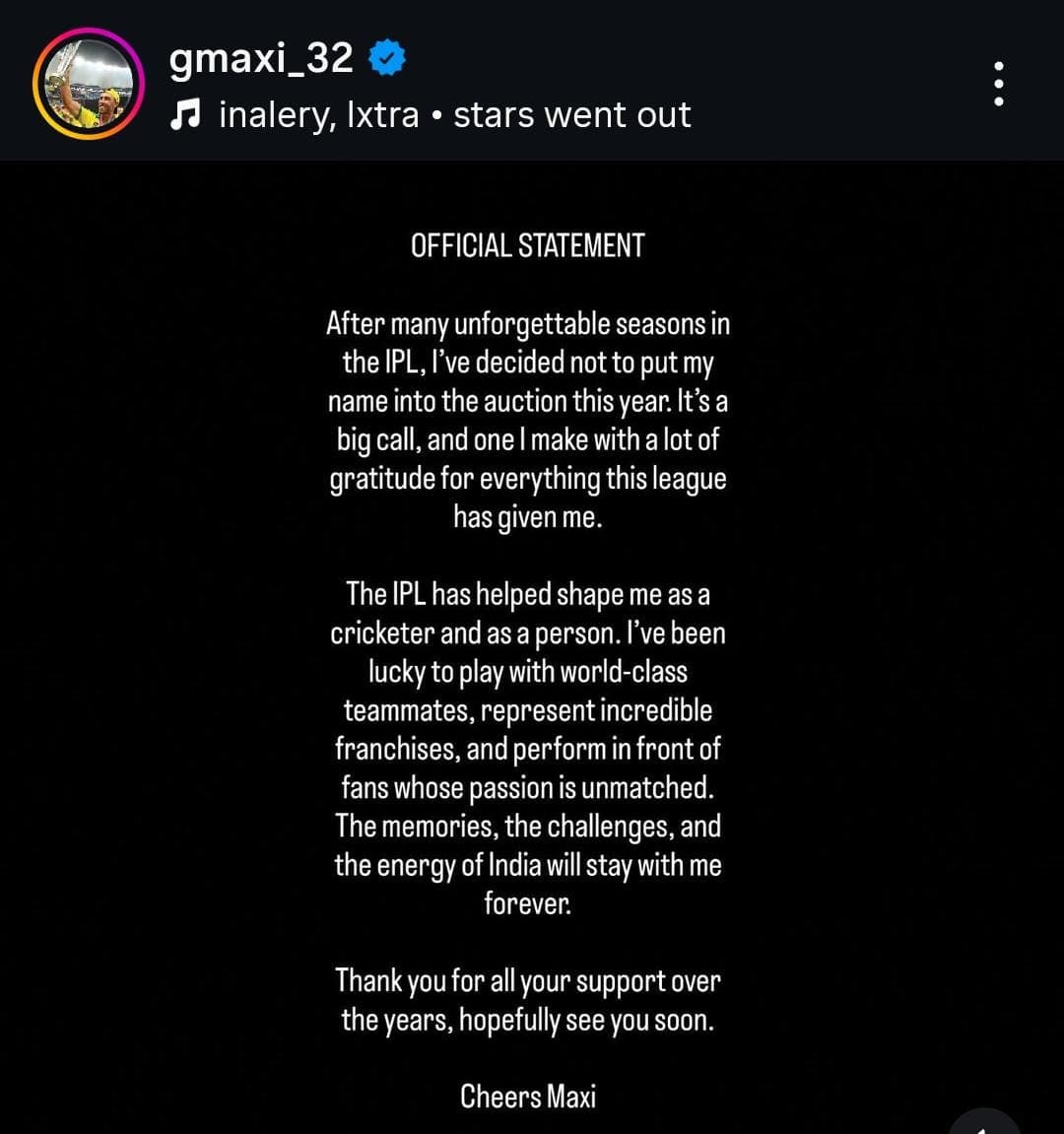 மேலும், நான் விளையாடிய எல்லா அணிகளும், ரசிகர்களின் அந்த ஆரவாரமான உற்சாகமும் என்றென்றும் என்னுடன் இருந்துகொண்டே இருக்கும் என்றும் மேக்ஸ்வெல் உருக்கமாக தெரிவித்துள்ளார். ஐபிஎல் மற்றும் இந்திய ரசிகர்களுக்கு நன்றி தெரிவித்திருக்கும் மேக்ஸ்வெல், விரைவில் சந்திப்போம் என்றும் கூறியுள்ளார். மேக்ஸ்வெல்லின் விலகல் ரசிகர்கள் மத்தியில் பெரும் அதிர்ச்சியை ஏற்படுத்தியுள்ளது. அதிரடி ஆட்டத்துக்கு சொந்தக்காரரான அவர், கடந்த சில ஆண்டுகளாகவே எதிர்பார்த்தளவுக்கு விளையாடவில்லை. பார்ம்அவுட், அடுத்தடுத்து காயம் காரணமாக கடந்த ஐபிஎல் போட்டியில் கூட பாதியில் விலகினார்.