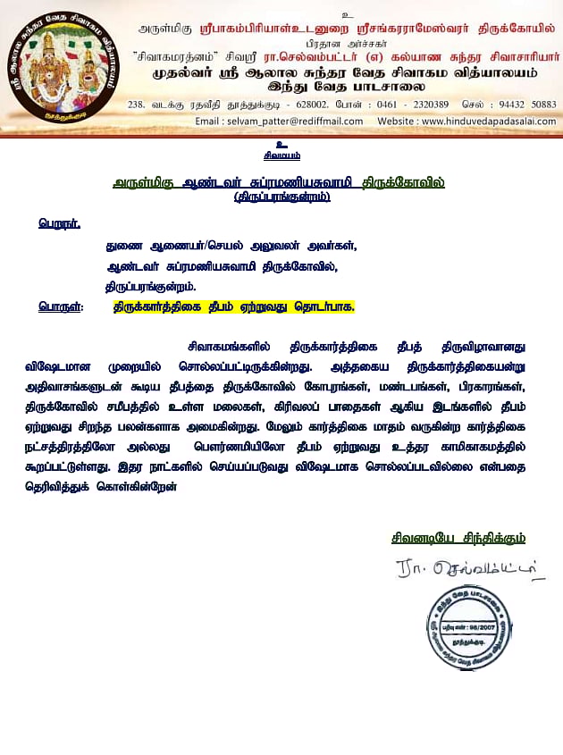 அதில், “சிவாகமங்களில் திருக்கார்த்திகை தீபத் திருவிழாவானது சொல்லப்பட்டிருக்கின்றது. அத்தகைய திருக்கார்த்திகையன்று அதிவாசங்களுடன் கூடிய தீபத்தை திருக்கோவில் கோபுரங்கள், மண்டபங்கள், பிரகாரங்கள், திருக்கோவில் சமீபத்தில் உள்ள மலைகள், கிரிவலப் பாதைகள் ஆகிய இடங்களில் தீபம் ஏற்றுவது சிறந்த பலன்களாக அமைகின்றது.