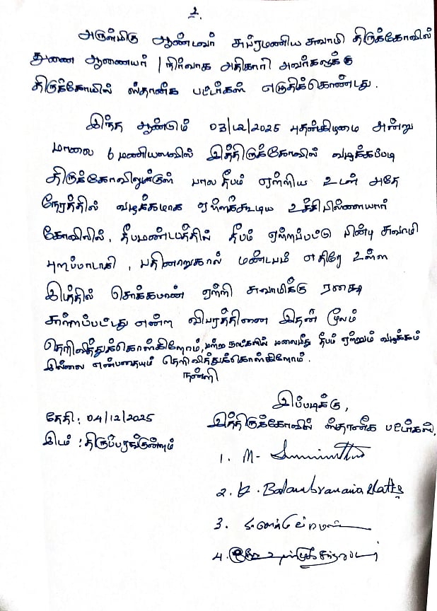 இந்நிலையில், “கார்த்திகை நாள் அன்று மலையில் உச்சிப் பிள்ளையார் கோயிலில் எப்போதும் போல தீபம் ஏற்றப்பட்டது. மற்ற நாட்களில் மலையில் தீபம் ஏற்றும் வழக்கம் இல்லை” என்று அருள்மிகு சுப்பிரமணிய சுவாமி திருக்கோவில் பட்டர்கள் கோவில் ஆணையருக்கு கடிதம் எழுதி இருக்கிறார்கள்