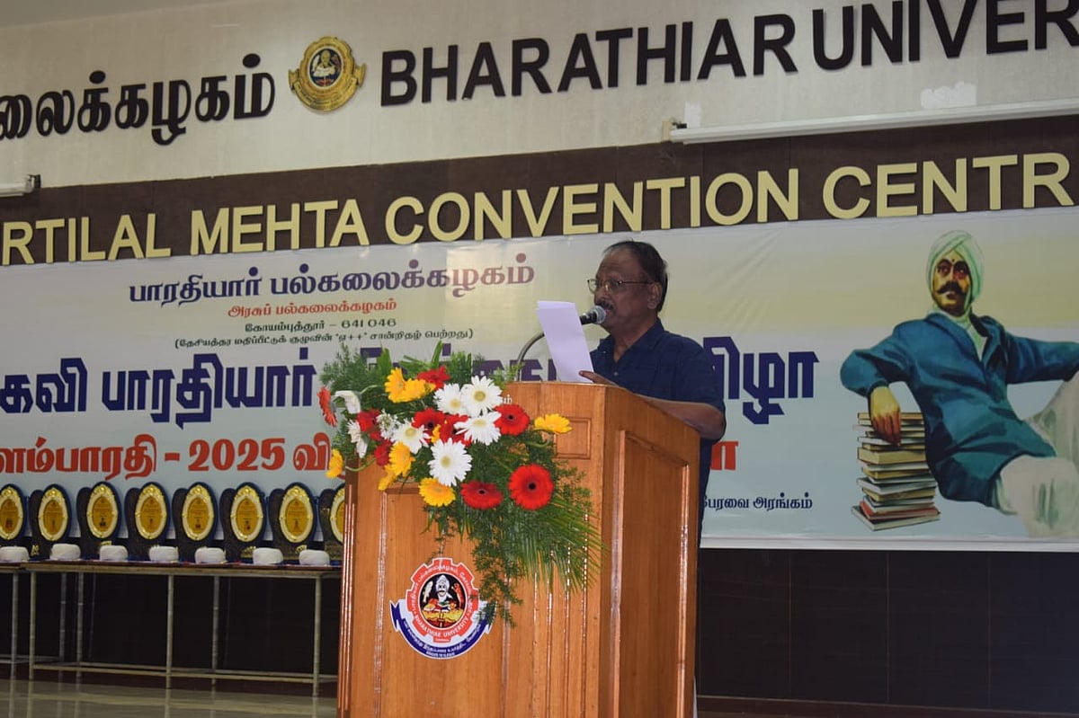 பாரதியார் பல்கலைக்கழகத்தில் மகாகவி பாரதியாரின் 144-வது பிறந்தநாள் விழாக் கொண்டாட்டம் மற்றும் இளம் பாரதி – 2025 விருது வழங்கும் விழா இன்று (11.12.2025) நடைபெற்றது. கோவை பாரதியார் பல்கலைக்கழகத்தின் உஷா கீர்த்திலால் மேத்தா அரங்கில் இந்த விழா நடைபெற்றது. இந்நிகழ்வில் பல்கலைக்கழகப் பதிவாளர் முனைவர் இரா.இராஜவேல், துணைவேந்தர் பொறுப்புக் குழு உறுப்பினர் துர்கா சங்கர் மற்றும் திரைப்படப் பாடலாசிரியர், பாவலர் அறிவுமதி முதலான அறிஞர்கள் கலந்துகொண்டு சிறப்பித்தனர்.