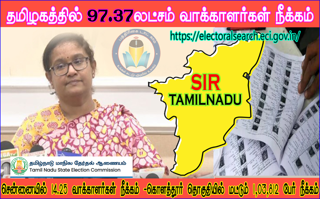 சென்னை: தமிழ்நாட்டில் ஒருமாதம் நடைபெற்ற வாக்காளர் பட்டியல் தீவிர சீர்திருத்ததிற்கு பிறகு இன்று மாலை தமிழ்நாடு தலைமை தேர்தல் ஆணையர் அர்சனா பட்நாயக் வரைவு வாக்காளர் பட்டியலை வெளியிட்டார். இந்த பட்டியலில், தமிழ்நாடு முழுவதும் மொத்தம் 97.37 லட்சம் வாக்காளர்கள் நீக்கம் செய்யப்பட்டு உள்ளது தெரிய வந்துள்ளது. தலைநகர் சென்னையில் மட்டும் 14.25 லட்சம் பேர் நீக்கம் செய்யப்பட்டு உள்ளதுடன், முதல்வர் தொகுதியான கொளத்தூர் தொகுதியில் மட்டும், 1,03,812 பேர் பெயர்கள் நீக்கப்பட்டு உள்ளது. இது அதிர்வலைகளை […]