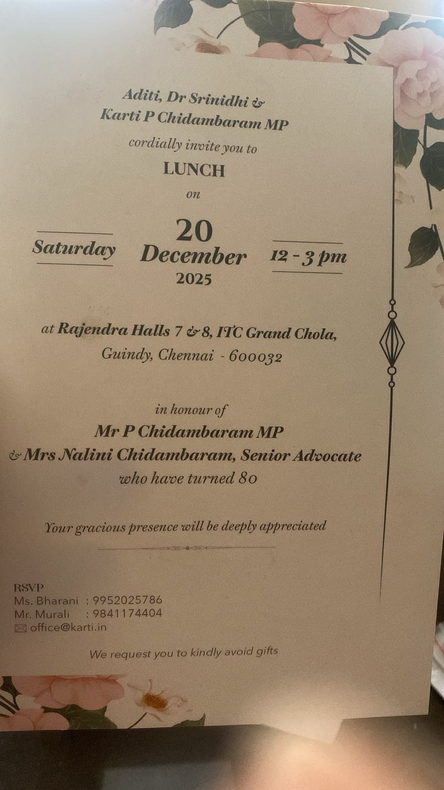 இதையொட்டி இவர்களது மகனும் எம்.பி.யுமான கார்த்தி சிதம்பரம் இதை செலிபிரேட் செய்யும்விதமாக நெருங்கிய நண்பர்கள் மற்றும் குடும்ப உறவுகள் சிலருக்கு மதிய விருந்துக்கு அழைப்பு விடுத்திருந்தார்.