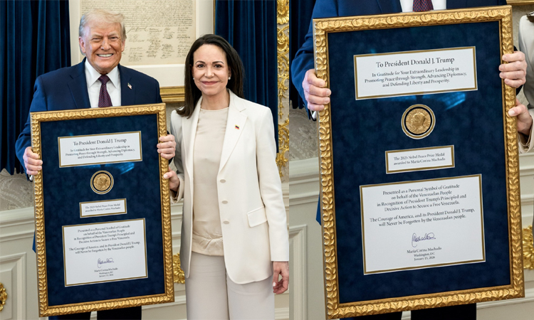 இதனிடையே கடந்த ஆண்டு அமைதிக்கான நோபல் பரிசு மரியா கொரினா மச்சாடோவுக்கு அறிவிக்கப்பட்டது. அப்போதே அந்தப் பரிசை அமெரிக்க ஜனாதிபதி டிரம்ப்புக்கு அர்ப்பணிப்பதாக அவர் தெரிவித்திருந்தார்.