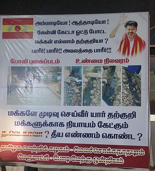 இதனால் கோபமடைந்த தமிழக வெற்றிக் கழகத்தினர் அந்தப் பேனருக்கு அருகாமையில், “கேள்வி கேட்டால் ஓட்டு போட்ட மக்களை தற்குறி எனக் கூறுவதா?” எனக் குறிப்பிட்டு திமுக கவுன்சிலர் வெளியிட்ட புகைப்படத்திற்கு உண்மை புகைப்படமாகச் சில புகைப்படங்களை வைத்து, “மக்களை முடிவு செய்வீர். யார் தற்குறி தவெகவா? தீய எண்ணம் கொண்ட?” குறிப்பிட்டு பேனர் வைத்துள்ளனர்.