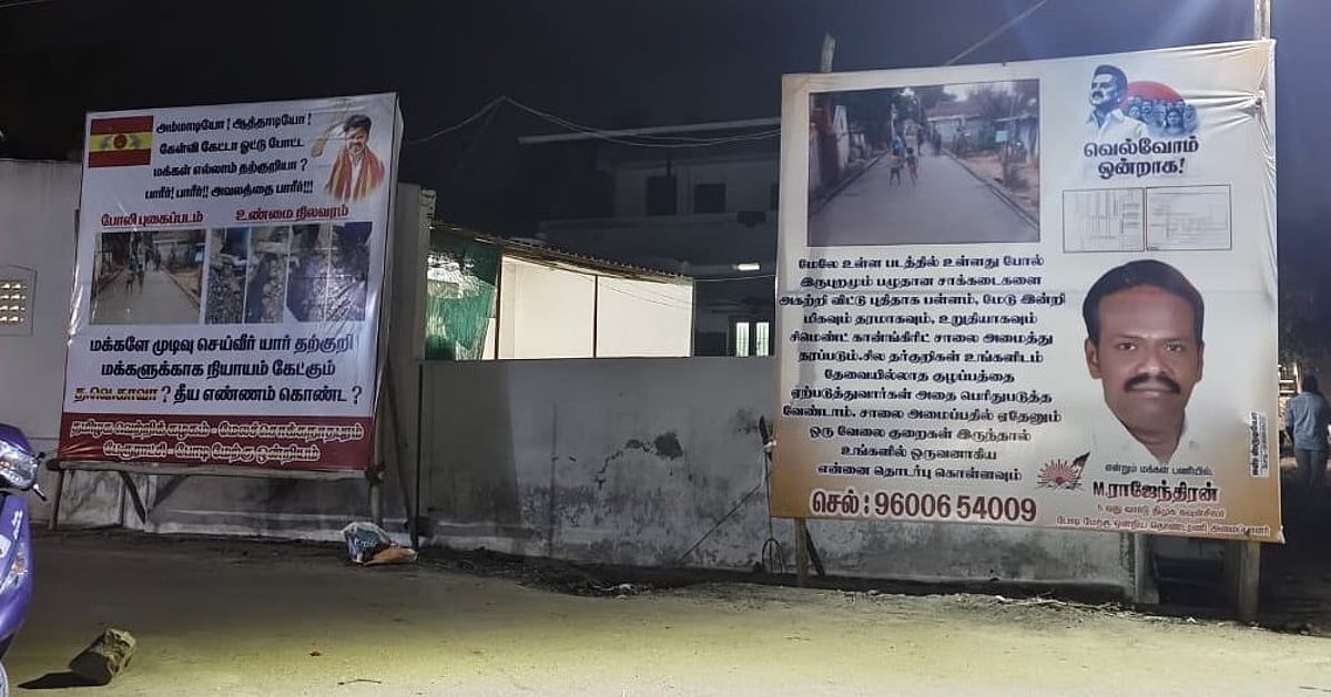 இந்நிலையில் நேற்று முந்தினம் இரவு திமுக கவுன்சிலர் ராஜேந்திரன் சார்பில் அந்தப் பகுதியில் பேனர் ஒன்று வைக்கப்பட்டது. அதில், “கழிவுநீர் கால்வாய் மற்றும் சாலைகள் தரமாக அமைக்கப்படும். இதில் சில தற்குறிகள் தேவையில்லாத குழப்பத்தை ஏற்படுத்துகிறார்கள், குறைகள் இருந்தால் கவுன்சிலர் ஆகிய என்னிடம் கூற வேண்டும்” எனத் தன்னுடைய தொலைபேசி எண்ணுடன் வினோபாஜி காலனி பகுதியில் பேனர் வைத்துள்ளார்.