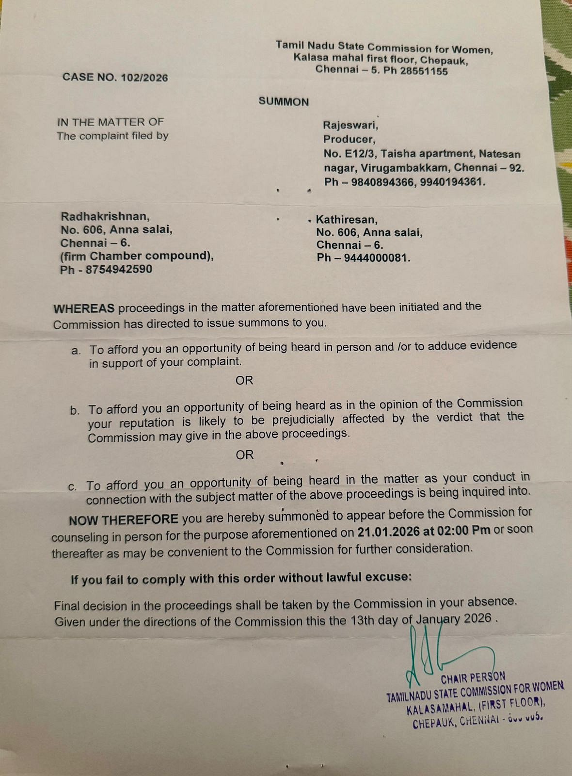 மகளிர் ஆணையம் சங்க செயலாளர்களான ராதாகிருஷ்ணன், கதிரேசன் இருவருக்கும் சம்மன் அனுப்பியிருக்கும் நிலையில் ராதாகிருஷ்ணைத் தொடர்பு கொண்டு இது குறித்துக் கேட்டதற்கு,