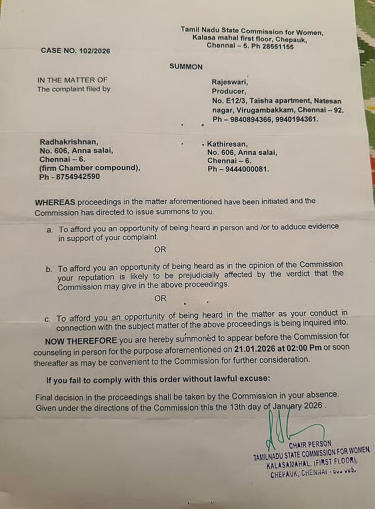 புகார் தொடர்பாக விசாரிக்க மகளிர் ஆணையத் தலைவர் ஏ.எஸ். குமாரி இரு தரப்புக்கும் சம்மன் அனுப்பியிருந்த சூழலில், கடந்த வாரம் தங்களூக்கு சம்மன் வரவில்லை எனச் சொல்லி தயாரிப்பாளர் சங்க செயலாளர் ராதாகிருஷ்ணனும் கதிரேசனும் ஆஜராகவில்லை.