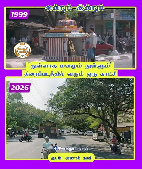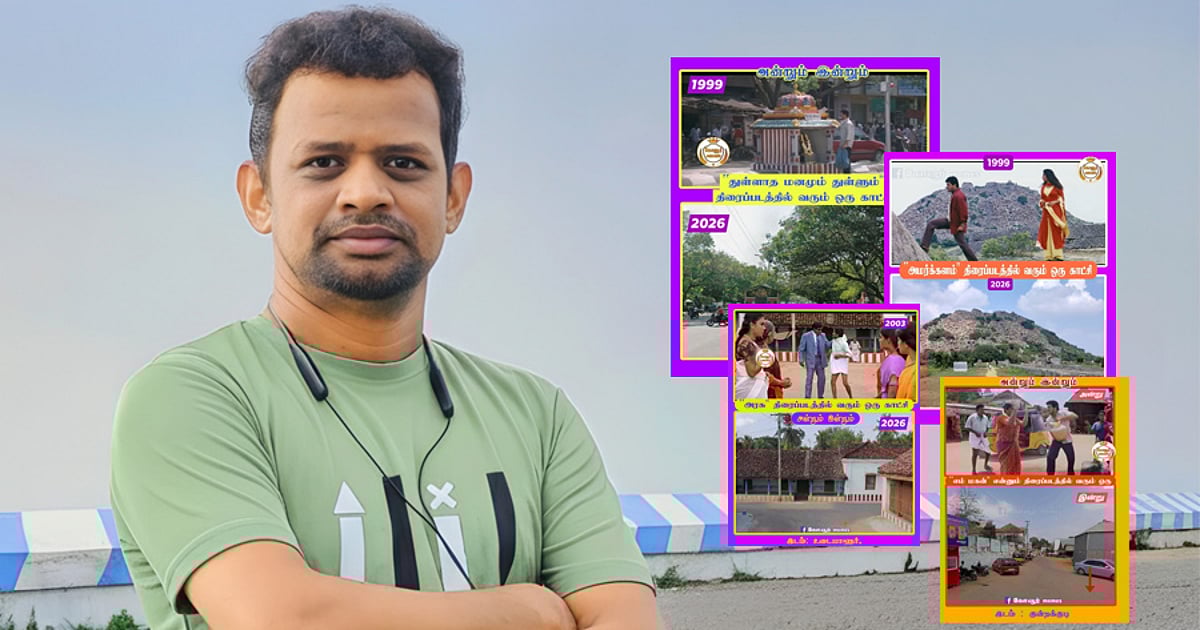 சோசியல் மீடியாவில் `கோவூர் மீம்ஸ்’ ஜெயகார்த்திக் என்பவர் அன்றும் இன்றும் எனும் தலைப்பில் சினிமாவில் ஒரு படத்தின் காட்சியில் வந்த முக்கிய இடம் இன்று எப்படி இருக்கிறது என நாஸ்டாலஜியா பதிவிட்டு வருகிறார். அவரின் பதிவுகள் அதிகம் கவனம் ஈர்ப்பவையாக இருக்க `கோவூர் மீம்ஸ்’ ஜெயகார்த்திக்கிடம் பேசினோம்..