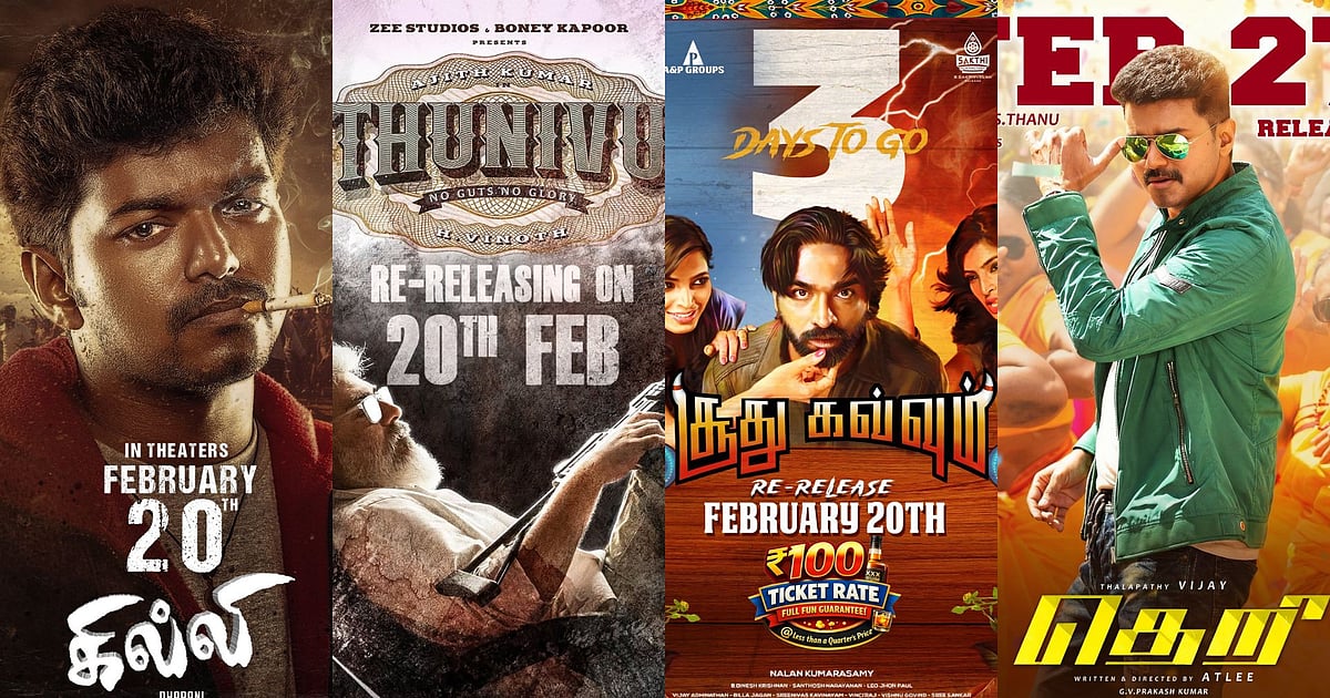 பிப்ரவரியில் திரைக்கு வந்த மற்றும் வரவிருக்கும் ரீ ரிலீஸ் படங்களின் புகைப்பட தொகுப்பு!| Photo Album February 18, 2026 by விகடன் ‘கில்லி’ From Feb 20 ‘துணிவு’ From Feb 20 ‘சூது கவ்வும்’ From Feb 20 ‘தெறி’ From Feb 27 ‘அமைதிப்படை’ Upcoming ‘தம்பி’ Upcoming ‘உயிருள்ளவரை உஷா’ Released ‘மௌனம் பேசியதே’ Released ‘மின்னலே’ Released ‘காதலர் தினம்’ Released ‘சிலம்பாட்டம்’ Released Source link