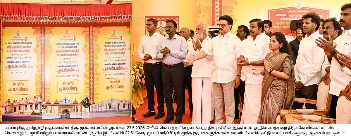 திருச்செந்தூர், சமயபுரம், இராமேஸ்வரம், பழநி, அழகர்கோவில், மருதமலை, திருவேற்காடு, பெரியபாளையம், சிறுவாபுரி உள்ளிட்ட 19 திருக்கோயில்களில் ரூ.1,770 கோடி