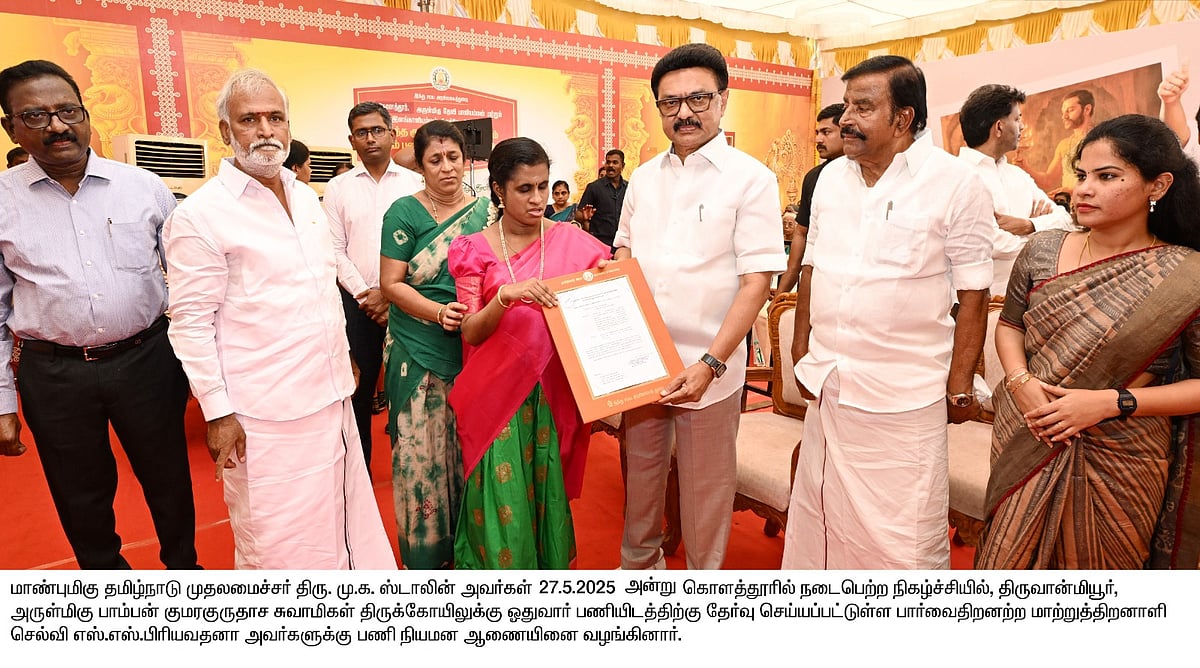 தமிழ்நாடு அரசுப் பணியாளர் தேர்வாணையத்தால் உதவி ஆணையர் பணியிடங்களுக்குத் தேர்வு செய்யப்பட்ட 21 பேர் உட்பட, 944 பேருக்கும், நிலுவையில் இருந்த பதவி உயர்வுகள் 946 அலுவலர்களுக்கும், கருணை அடிப்படையில் 34 பேருக்கும் பணி நியமன ஆணைகள் வழங்கப்பட்டுள்ளன. திருக்கோயில்களில் ஐந்து ஆண்டுகளுக்கு மேல் தொகுப்பூதியத்தில் பணியாற்றி வந்த 1,351 பணியாளர்கள் பணிவரன்முறைப்படுத்தப்பட்டுள்ளனர்.