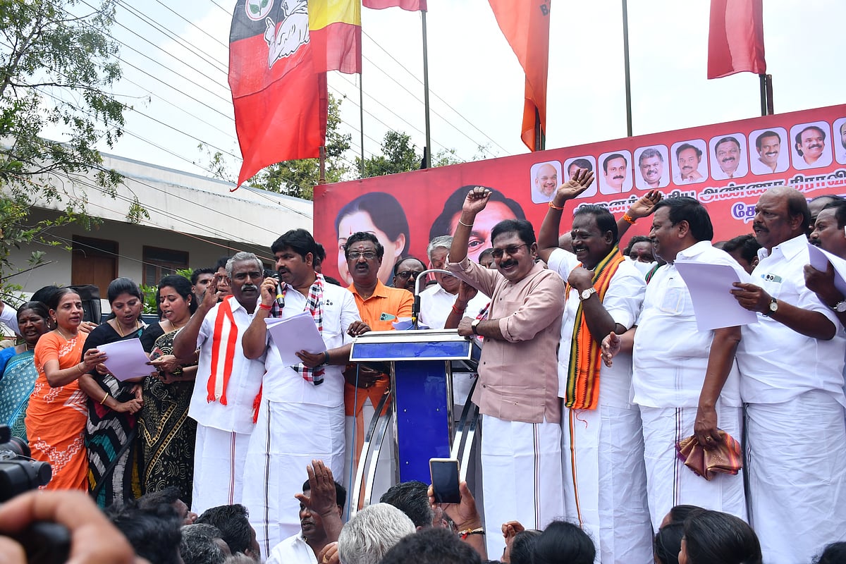 அதிமுக தலைமையிலான தேசிய ஜனநாயக கூட்டணியின் கட்சிகள் இணைந்து, தமிழ்நாட்டில் நிலவும் பாலியல் கொடுமைகள், போதைப்பொருள்கள் புழக்கம் உள்ளிட்ட சட்டவிரோத செயல்களைத் தடுக்க தவறியதாக… திமுக அரசைக் கண்டித்து ஆர்ப்பாட்டம் நடத்தின. தஞ்சாவூரில் அமமுக பொதுச்செயலாளர் டி.டி.வி.தினகரன் தலைமையில் நடைபெற்ற ஆர்ப்பாட்டத்தில் கூட்டணிக் கட்சி நிர்வாகிகள் உள்ளிட்ட பலர் கலந்து கொண்டனர். அதிமுக-வின் தஞ்சாவூர் மாநகரச் செயலாளர் என்.எஸ்.சரவணன் உள்ளிட்ட நிர்வாகிகள் தினகரனுக்கு மரியாதை செலுத்தினர். முடிவில் திமுக அரசைக் கண்டித்து கோஷங்கள் எழுப்பபட்டது.