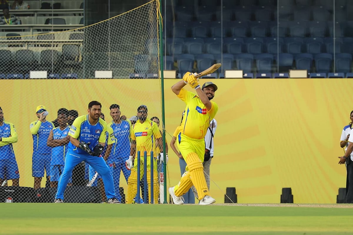 தோனியின் பேட்டோடு சேலஞ்சுக்கு வந்த சுரேஷ் ரெய்னா ஸ்ரேயாஸ் கோபாலின் ஓவரில் 5 பவுண்டரிக்களை அடித்து அசத்த தோனி அவரை ஆரத்தழுவி மகிழ்ச்சியை வெளிப்படுத்தினார்.