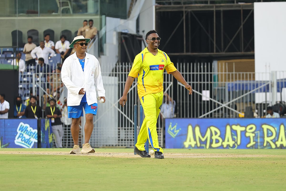 அம்பத்தி ராயுடுவுக்கு பிராவோ பந்து வீசிய போது அம்பயர் ஒரு ஒயிடு கொடுத்தார். தோனி அதற்கு ஜாலியாக ரிவியூவ் எடுக்கவே, ஆர்.ஜே.பாலாஜி தேர்டு அம்பயர் போல மிமிக்ரி செய்து கலகலப்பாக்கினார்.