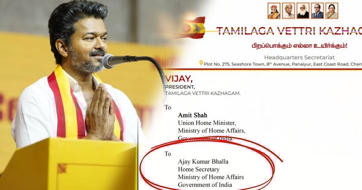 ஆனால், கடிதத்தில் பெறுநர் இடத்தில் உள்துறை செயலாளர் கோவிந் மோகனின் பெயரை குறிப்பிடாமல், மணிப்பூர் ஆளுநர் அஜய் பல்லாவின் பெயரை குறிப்பிட்டிருக்கின்றனர். அஜய் பல்லா உள்துறைச் செயலாளராக இருந்து கடந்த 2024 ஆம் ஆண்டே ஓய்வு பெற்றுவிட்டனர். இப்போது அவர் மணிப்பூரின் ஆளுநராக இருக்கிறார் என்பது குறிப்பிடத்தக்கது. உள்துறைச் செயலாளரின் பெயரை கூட சரியாக குறிப்பிடத் தெரியாதா என தவெகவை சமூகவலைதளங்களில் ஜாலியாக கலாய்த்து வருகின்றனர்.