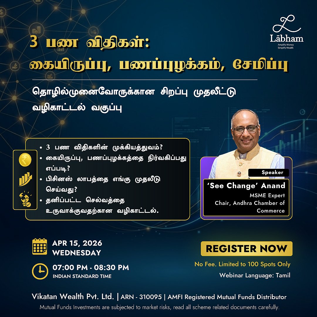 வரும் புதன்கிழமை, 15 ஏப்ரல் 2026 அன்று இரவு 7:00 மணிக்கு நடைபெறும் இந்த வெபினாரில் உங்களுக்கான Wealth-building ரோட்மேப்பை உருவாக்க இன்றே பதிவு செய்யுங்கள். (100 இடங்கள் மட்டுமே, முன்பதிவு கட்டாயம்)